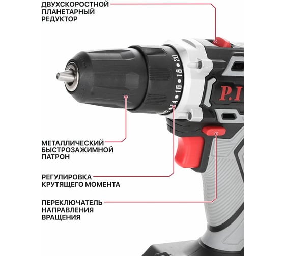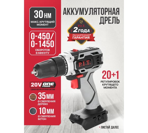 Аккумуляторная дрель P.I.T. SOLO 20 В, 30 Нм, патрон 10 мм, 2 ск., коробка PBM20H-10B
