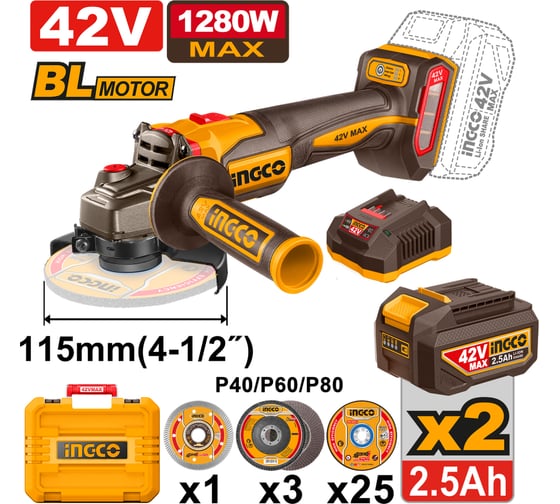 Аккумуляторная УШМ INGCO 42В 115 мм, б/щ (4) INDUSTRIAL CAGLI4128112