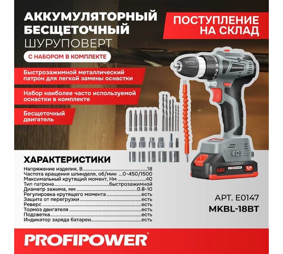 Аккумуляторный бесщеточный шуруповерт с набором Profipower MKBL-18BT E0147