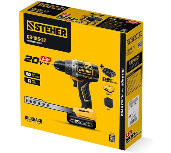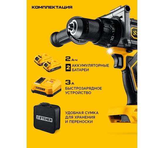 Бесщеточная дрель-шуруповерт STEHER 20 В, 165 Н·м, 2 АКБ LMS (2 А·ч), сумка CB-165-22