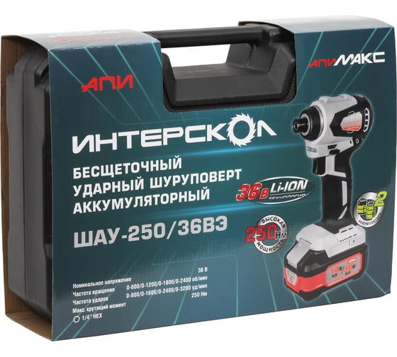 Бесщеточный ударный аккуммуляторный шуруповерт Интерскол ШАУ-250/36ВЭ Li-ion АПИ (кейс, 2 аккум. 2,0Ач, ЗУ) 862.2.2.70