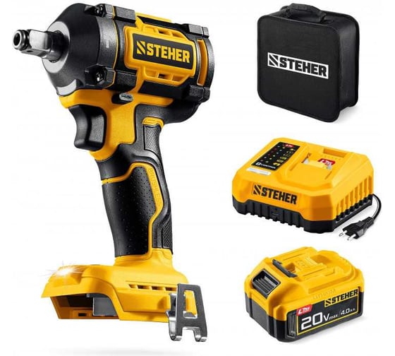 Бесщеточный ударный гайковерт STEHER 20 В, 350 Н·м, 1 АКБ LMS (4 А·ч), сумка CWB-350-41