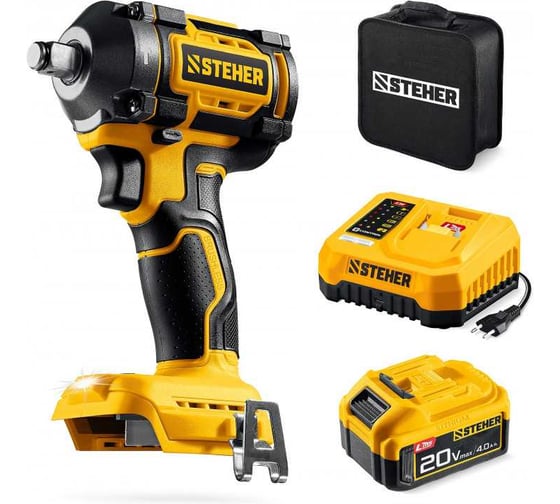 Бесщеточный ударный гайковерт STEHER 20 В, 500 Н·м, 1 АКБ LMS (4 А·ч), сумка CWB-500-41