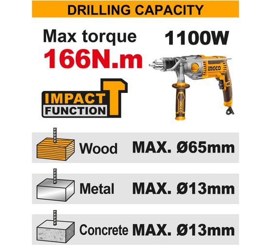 - Max диаметр сверления (металл)13 мм