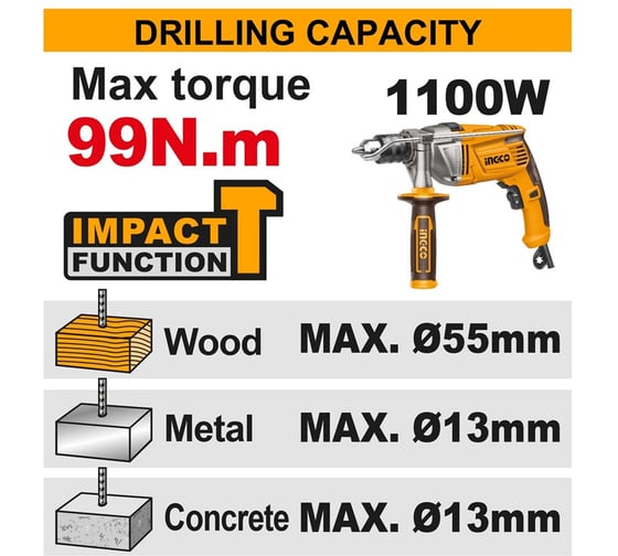 - Max диаметр сверления (металл)13 мм