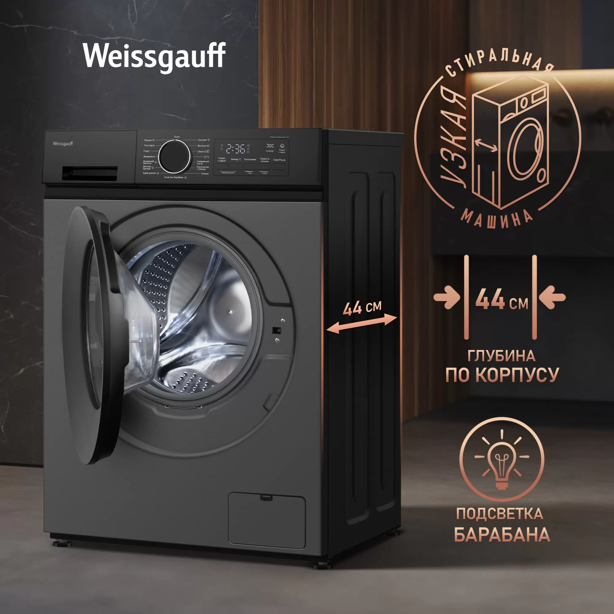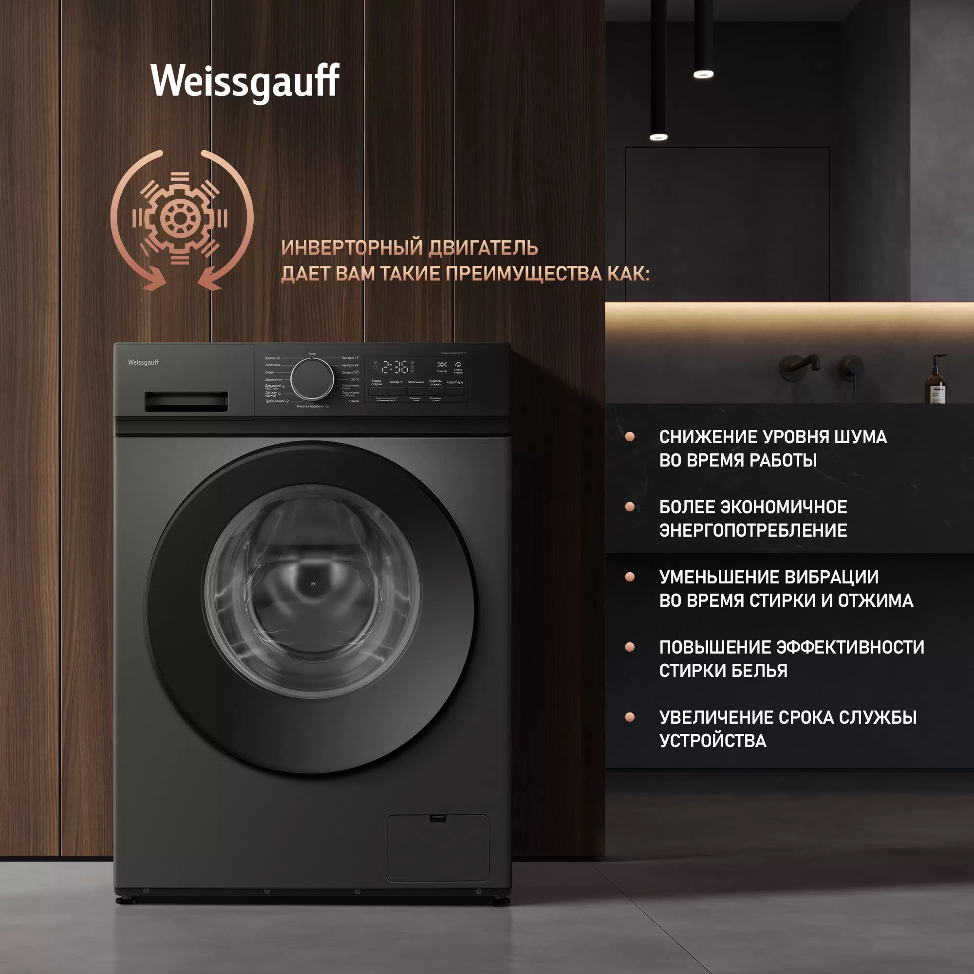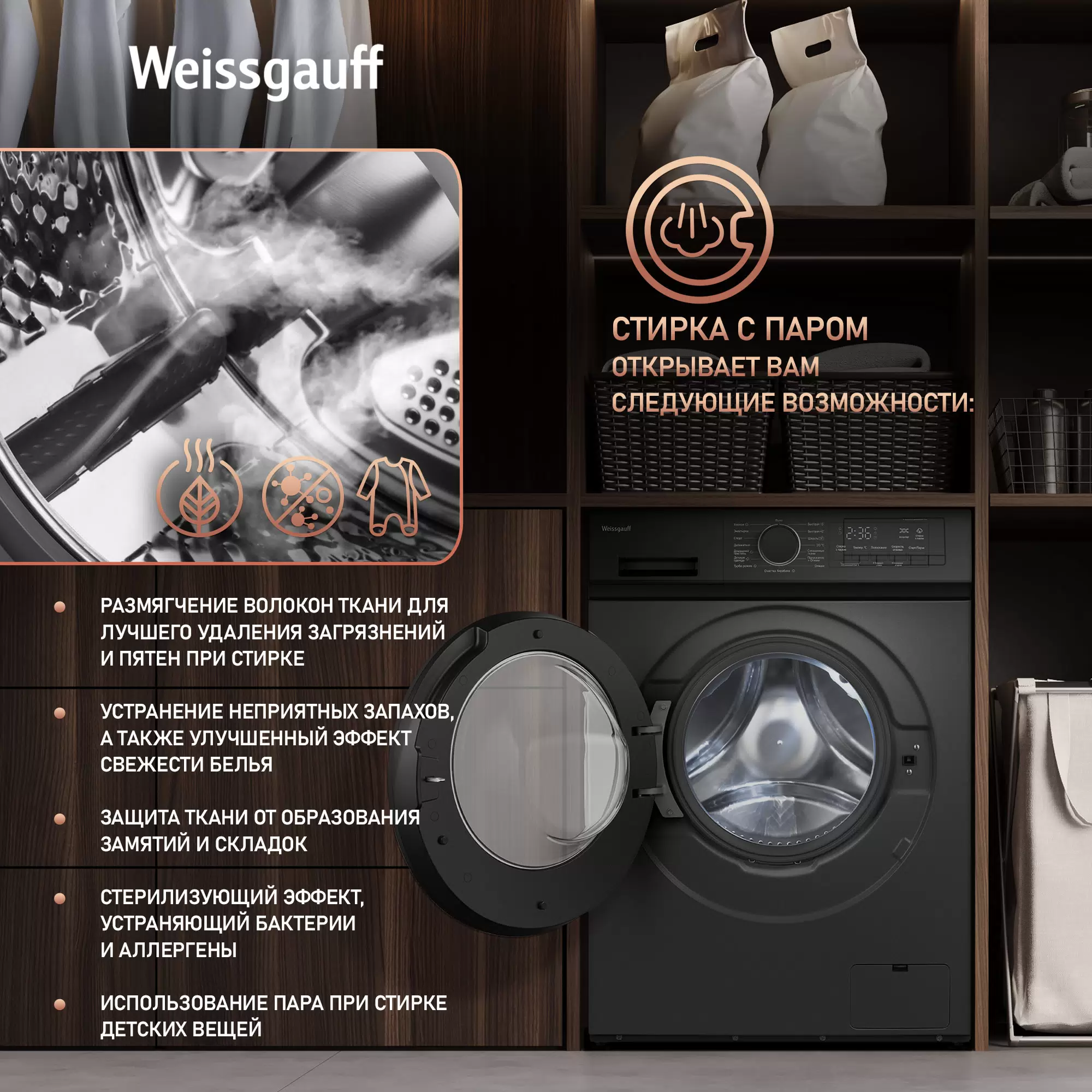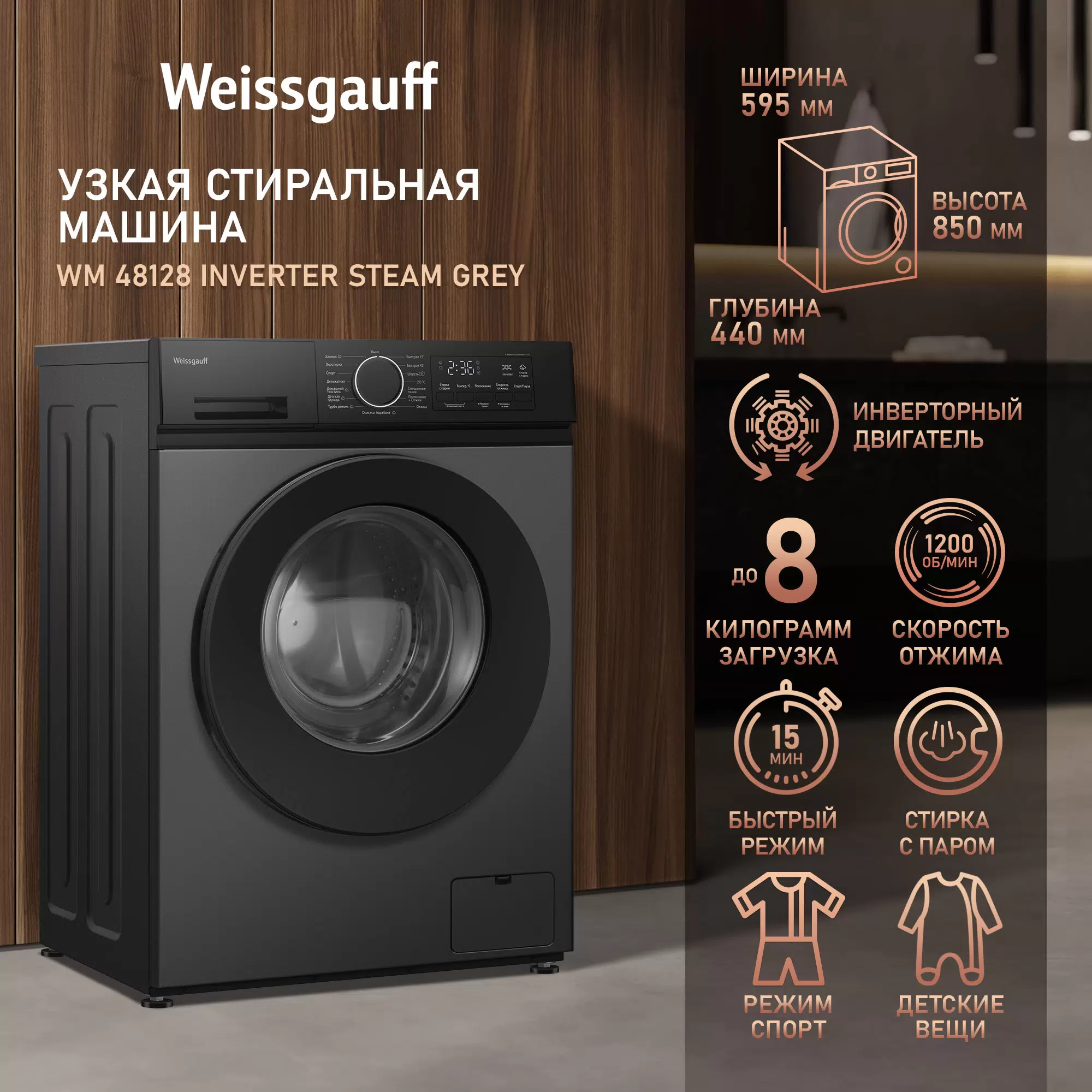 Cтиральная машина с инвертором и паром Weissgauff WM 48128 Inverter Steam Grey