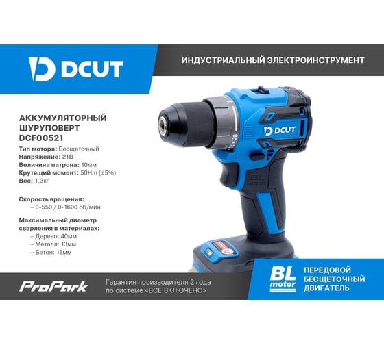 Дрель аккумуляторная DCUT DCF00521, 50Нм, 2 скорости, 0-5001600обм, коробка, бакк и зу, сервис 2года DCF00521-SP2