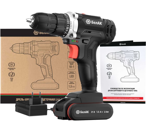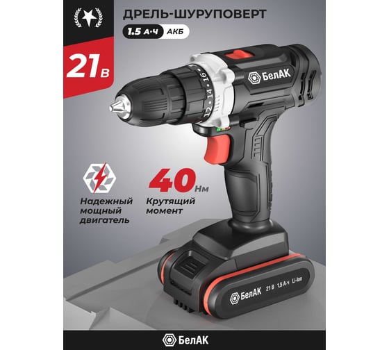 Дрель-шуруповерт БелАК щеточная, 21V 40Hm, в коробке, 1 АКБ БАК.53310