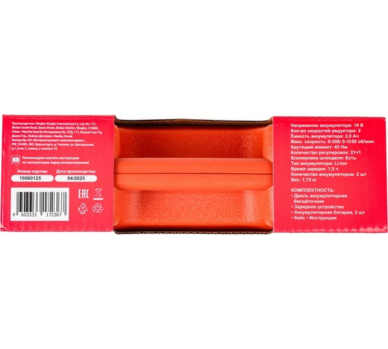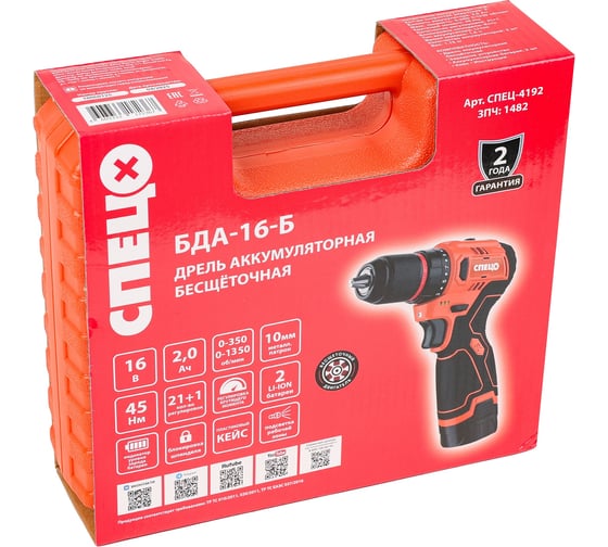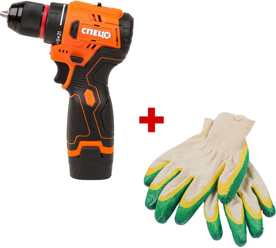 Дрель-шуруповерт Спец БДА-16-Б, аккуммуляторная,бесщеточная,16В, 2аккум *2,0Ач, 45Нм, реверс + перчатки СПЕЦ-4192/И-8076-И