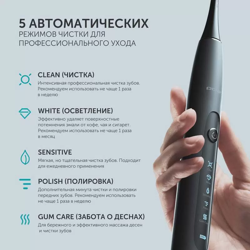 - Режимы работыдля чувствительных зубов; ежедневная чистка; отбеливание; полировка; уход за деснами