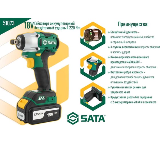 Гайковерт аккумуляторный бесщеточный ударный SATA 220 Нм. SC51073
