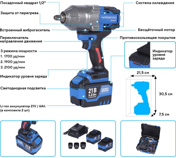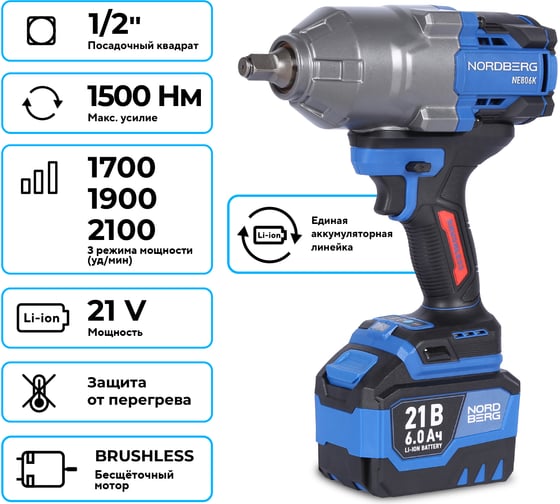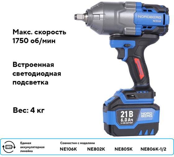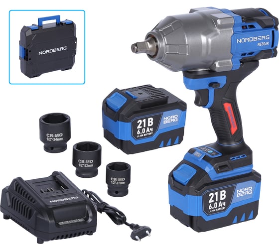 Гайковерт аккумуляторный NORDBERG 1/2, 21В, 1500 Нм с двумя 6A аккум. и зар. уст-вом, в кейсе NE806K-1/2