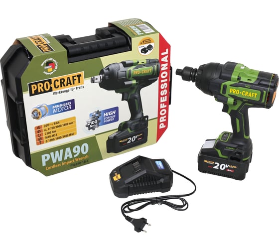 Гайковерт аккумуляторный PROCRAFT PWA90 20В 2100Нм (АКБ 8Ач + ЗУ) Кейс PWA90-1b-c