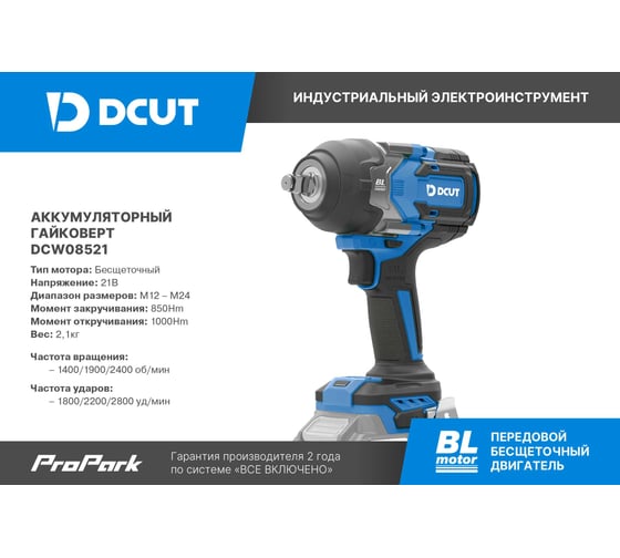 Гайковерт ударный ак. DCUT DCW08521, 1/2, 85Нм, на откруч. -1100Нм, дв.подсветка, D21, 4 реж. удар DCW08521-SP2