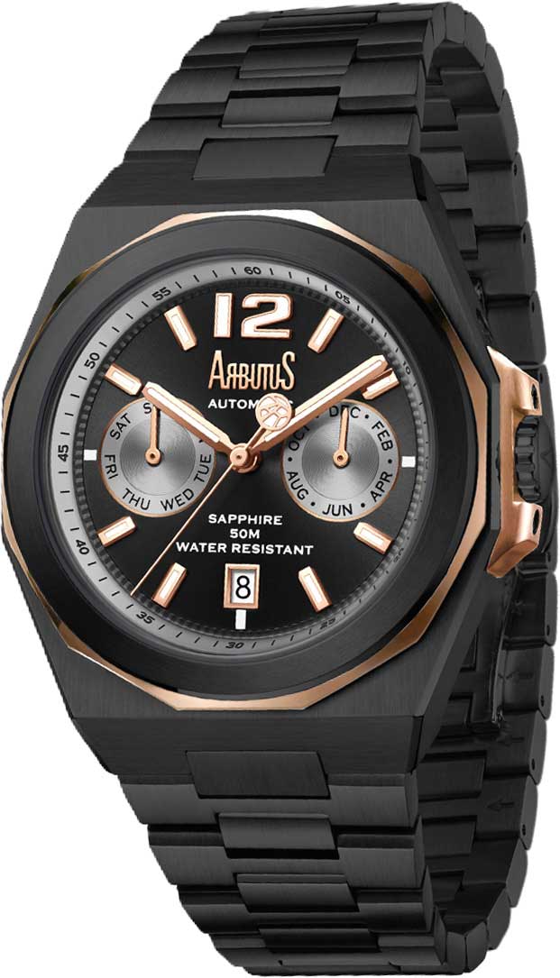 Wall Street Rotor. Мужские часы. В механизме 26 камней,частота 28800 полуколебаний в час. Запас хода 40 часов. Функция stop-second. Возможность ручного завода. Циферблат выполнен по технологии Sunray (солнечные лучи) и защищен прочным сапфировым стеклом. Метки в виде штрихов и арабской цифры 12. Метки и стрелки с люминесцентным покрытием, которое светится в темноте после непродолжительной зарядки на свету. Окошко даты находится в положении 6 часов. Индикация месяца и дня недели вынесена на отдельные циферблаты. Рифленая заводная головка. Прозрачная задняя крышка крепится на 4-х винтах. Браслет с раскладывающейся застежкой и системой быстрой замены.