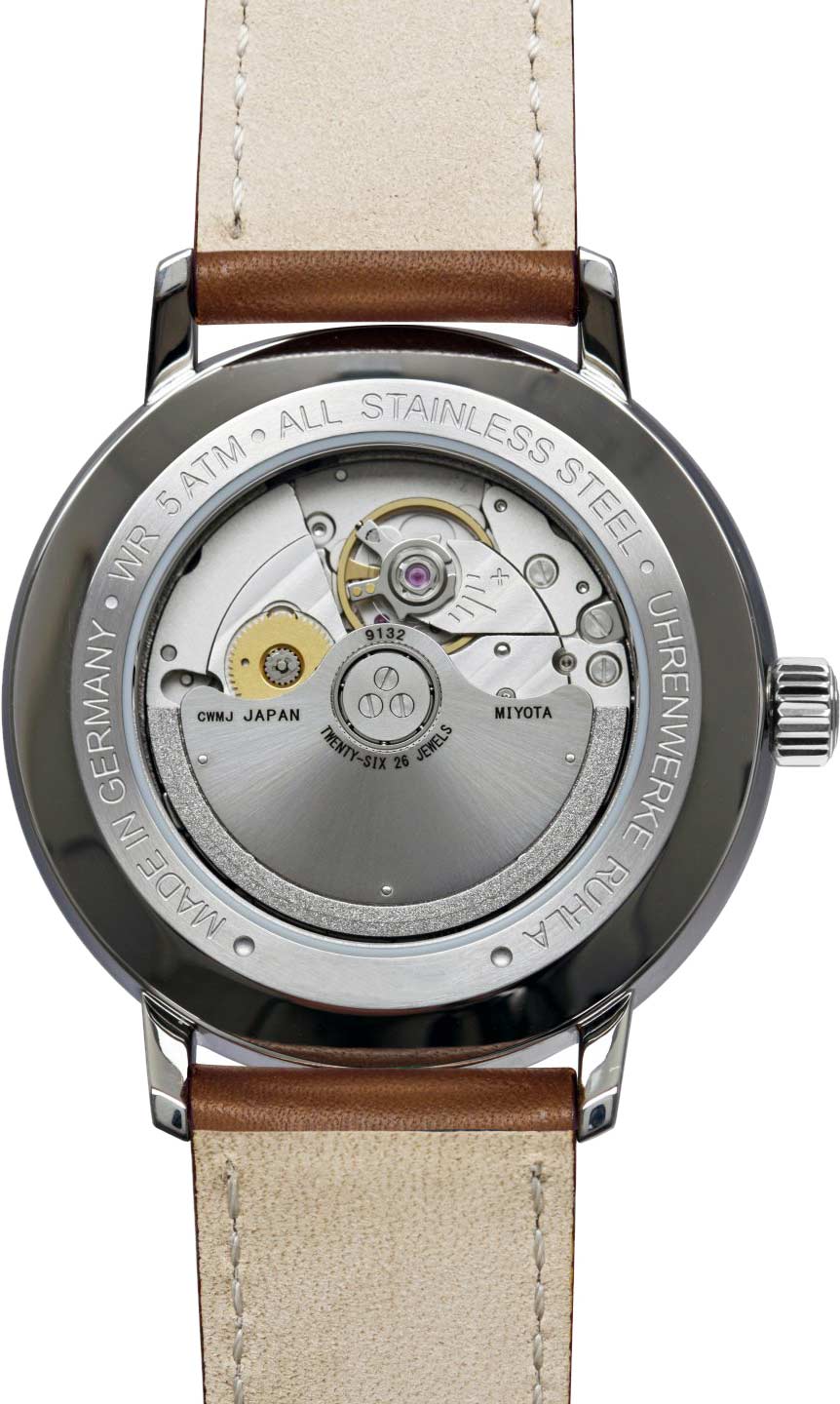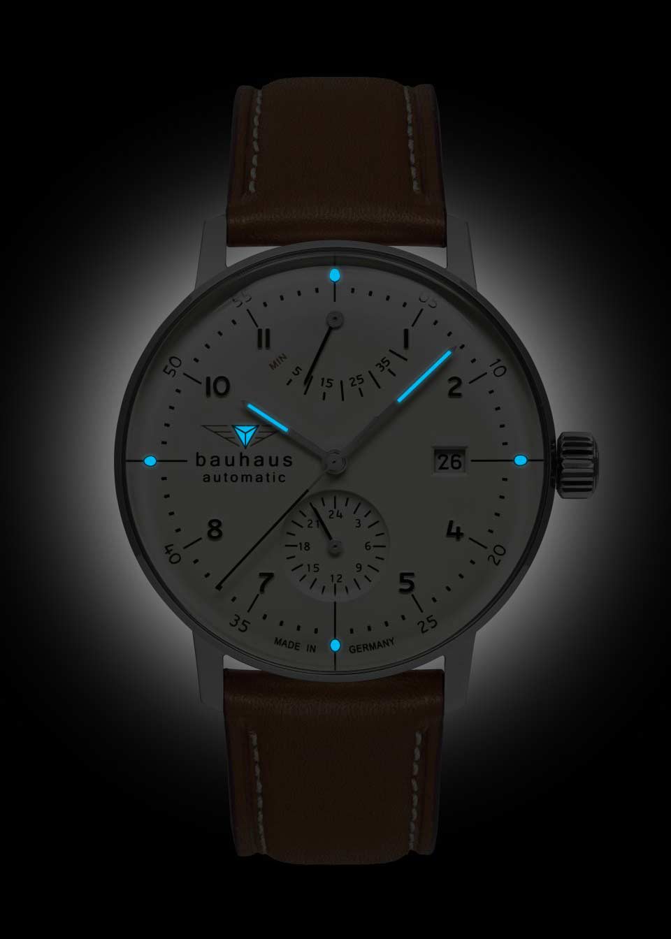 Заостренные прямоугольные стрелки в стиле Baton. Метки и стрелки с люминесцентным покрытием, которое светится в темноте после непродолжительной зарядки на свету. Рифленая заводная головка. Прозрачная задняя крышка. Удобный кожаный ремешок.