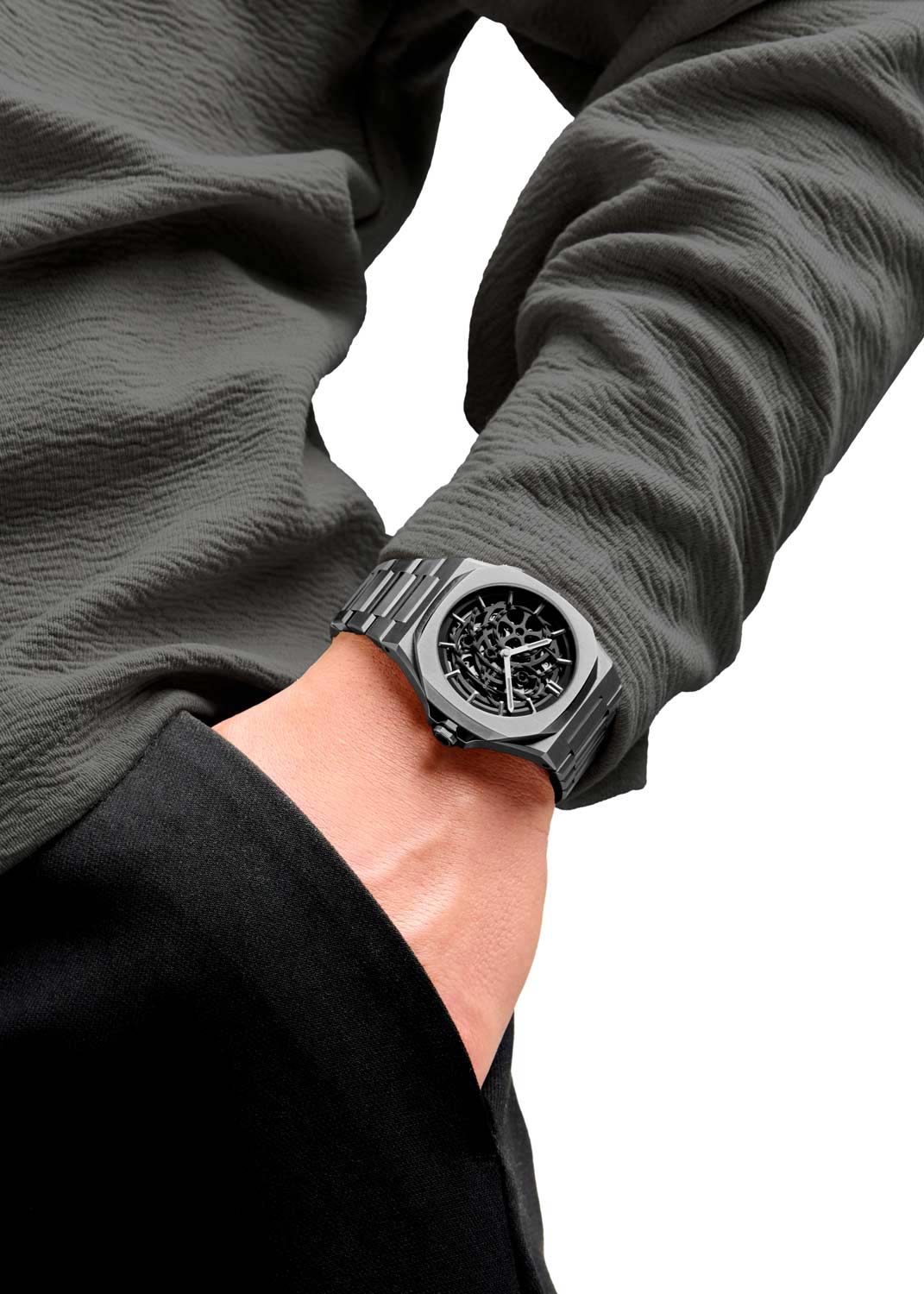 Открытый циферблат этого элегантного аксессуара откроет взору превосходную работу точного часового механизма. Gun Metal. Скелетонизированные часы. В механизме 24 камня, частота 21600 полуколебаний в час. Запас хода 41 час. Метки в виде штрихов. Заводная головка с защитой. Прозрачная задняя крышка крепится на 8-ми винтах. Браслет с раскладывающейся застежкой.