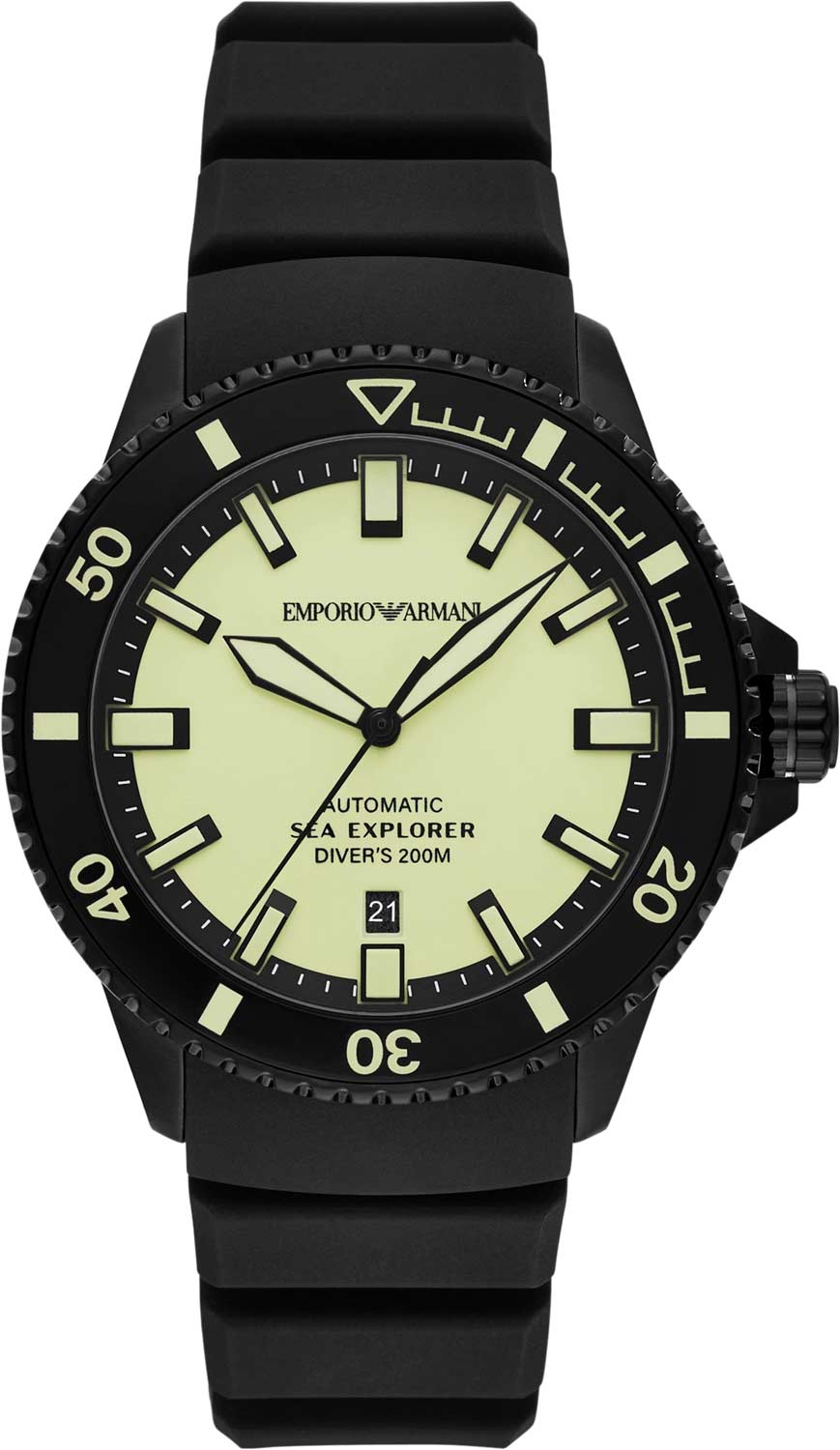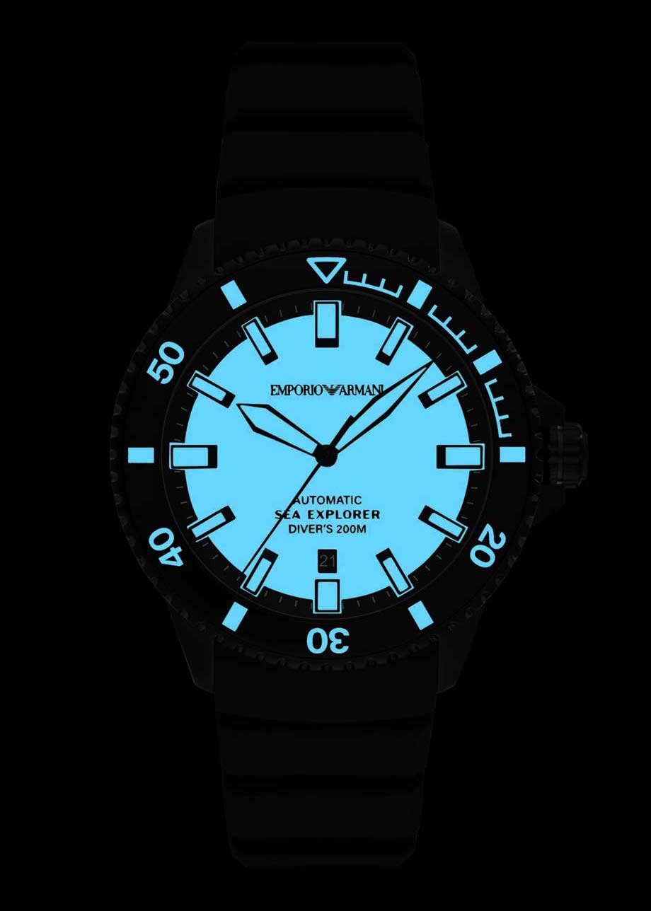 Стрелки, метки на циферблате и безеле с люминесцентным покрытием, которое светится в темноте после непродолжительной зарядки на свету. Окошко даты находится в положении 6 часов.
