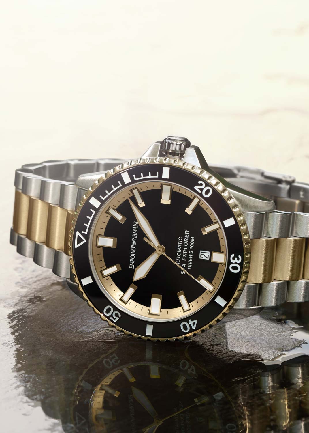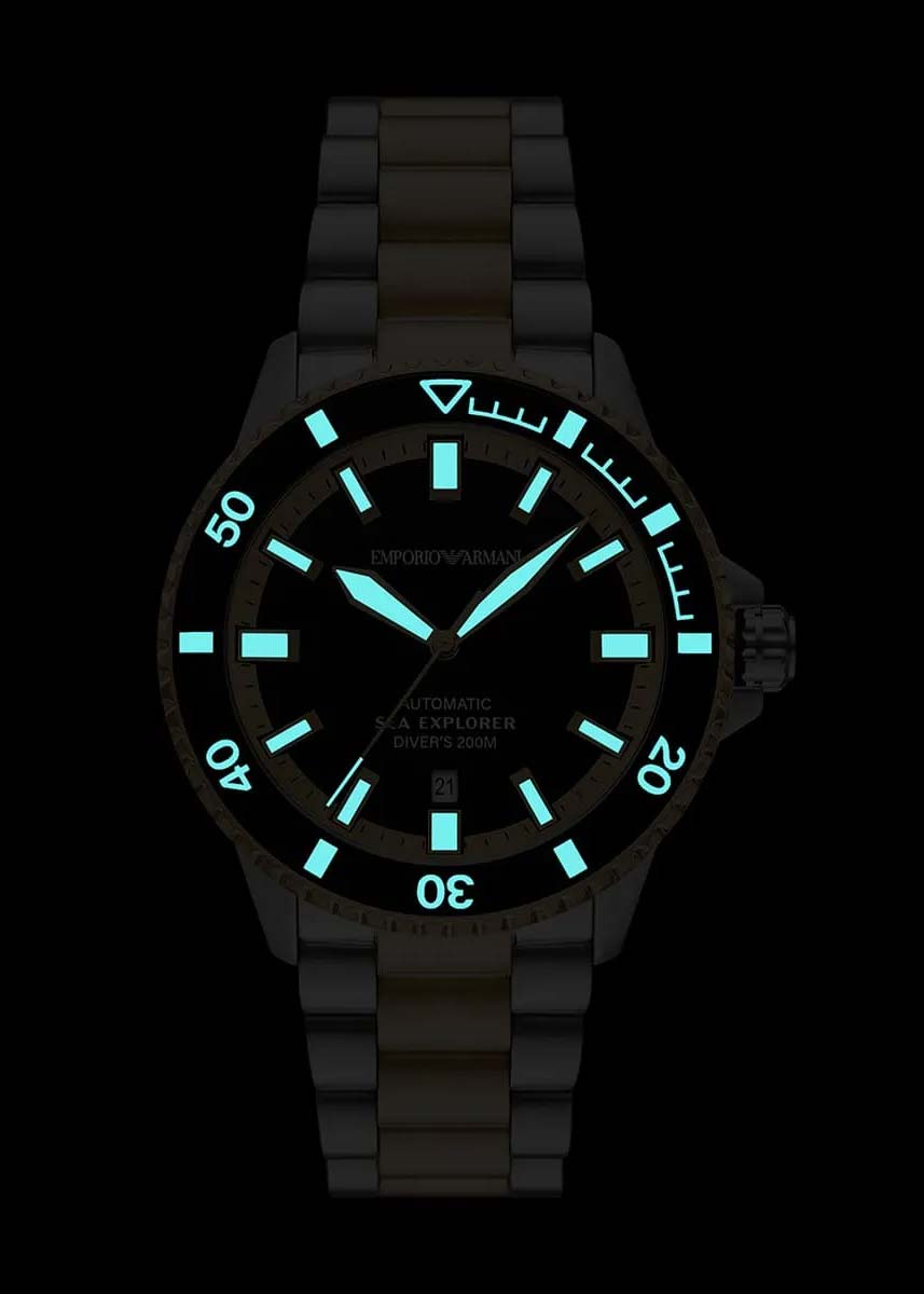 Sea Explorer. Мужские механические наручные часы с запасом хода 42 часа. Круглый корпус из нержавеющей стали. Циферблат с маркировкой ''Diver's 200М''. Часы сертифицированы согласно стандарту ISO 6425. Стрелки и метки на циферблате и безеле с люминесцентным покрытием Super-Luminova, которое светится в темноте после непродолжительной зарядки на свету.
