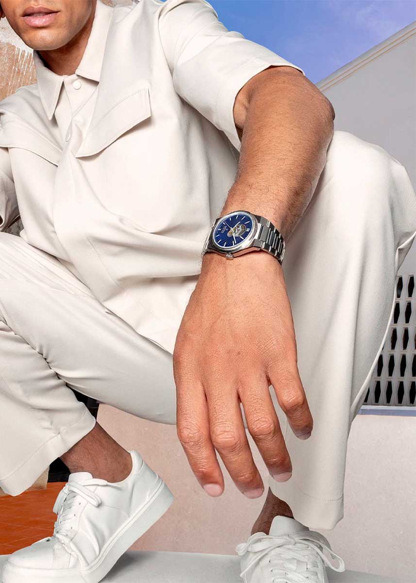 Циферблат выполнен по технологии Sunray (солнечные лучи) с текстурированным узором, создающим эффект глубины. Накладные метки в виде штрихов. Прямоугольные стрелки в стиле Baton. Метки и стрелки с люминесцентным покрытием, которое светится в темноте после непродолжительной зарядки на свету.