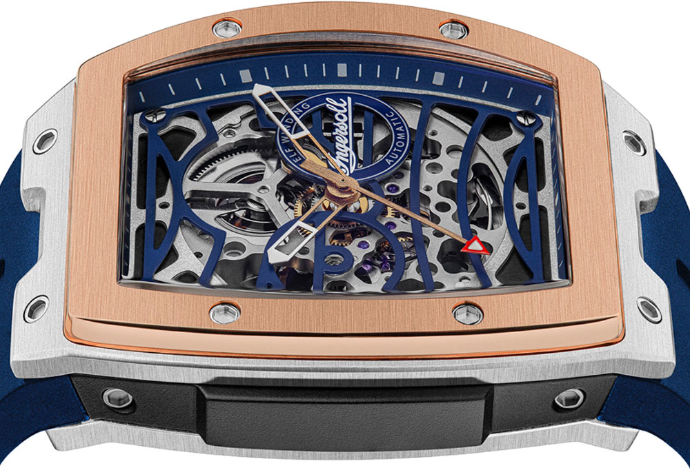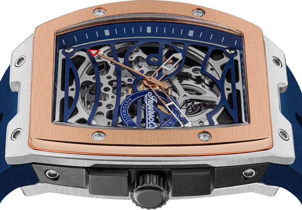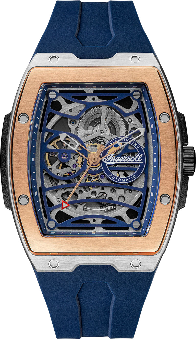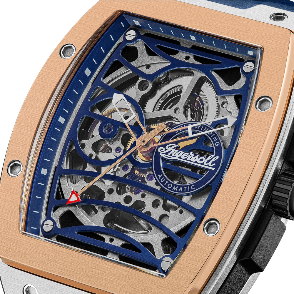 Скелетонизированные часы. В механизме 22 камня. Бочкообразный стальной корпус. Рифленая заводная головка с защитой. Прозрачная задняя крышка крепится на 6 винтах. Каучуковый ремешок с классической застежкой.