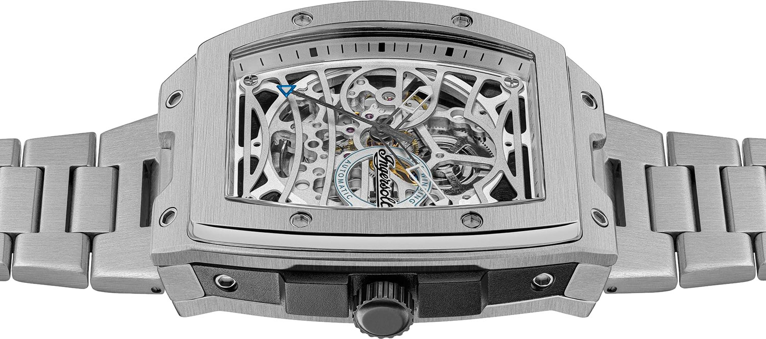 Скелетонизированные часы. В механизме 22 камня. Бочкообразный стальной корпус. Рифленая заводная головка с защитой. Прозрачная задняя крышка крепится на 6 винтах. Стальной браслет с раскладывающейся застежкой.