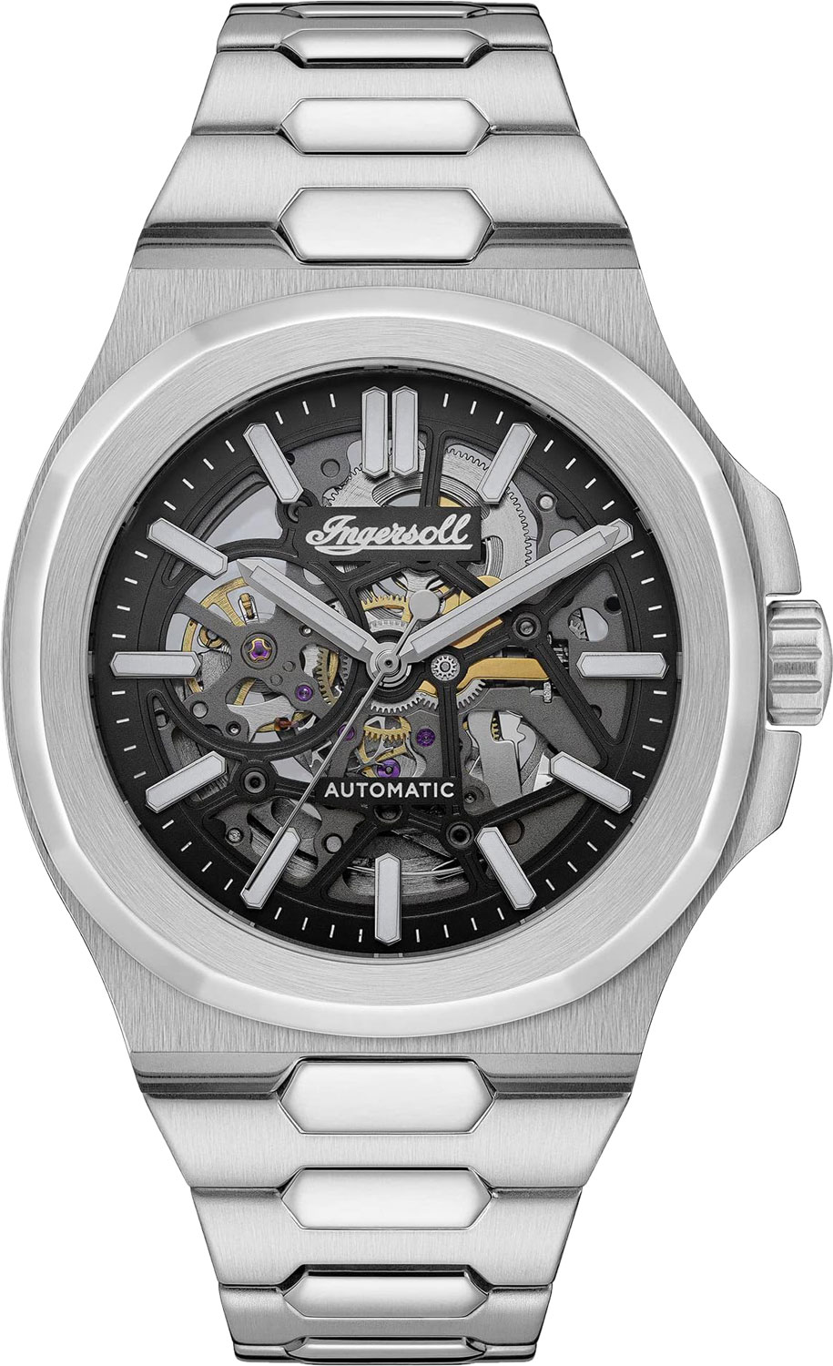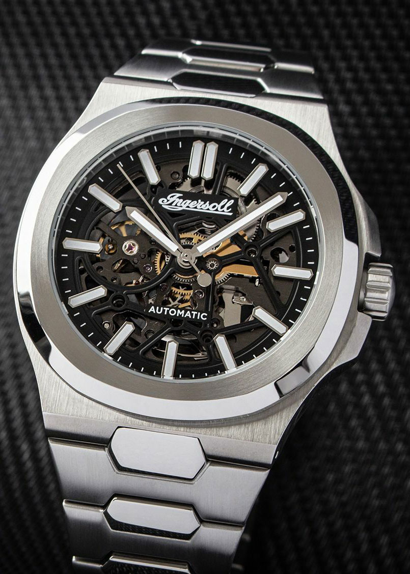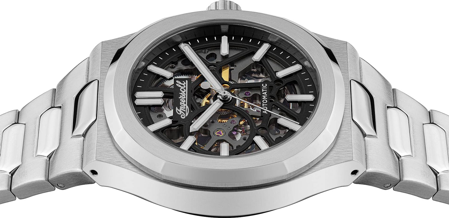 Скелетонизированные часы. В механизме 20 камней. Стальной корпус. Циферблат с метками в виде штрихов. Рифленая заводная головка с защитой. Завинчивающаяся прозрачная задняя крышка. Стальной браслет с раскладывающейся застежкой.