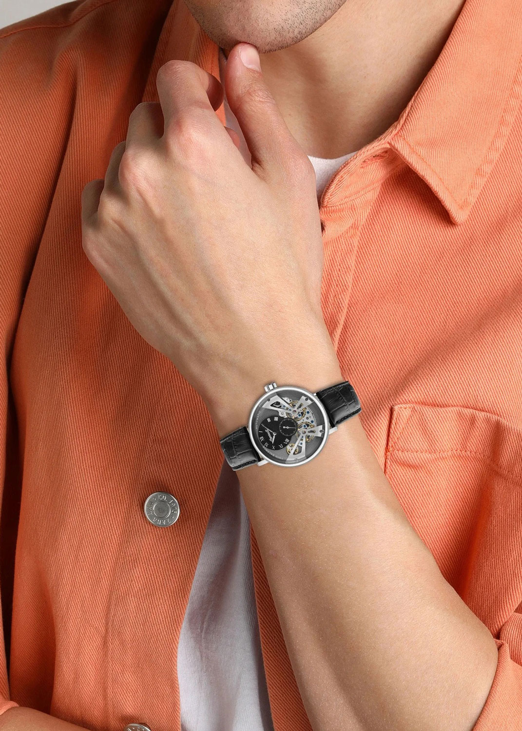 Скелетонизированные часы. В механизме 45 камней. Круглый стальной корпус. Метки в виде римских цифр. Секундная стрелка вынесена на отдельный циферблат. Рифленая заводная головка.