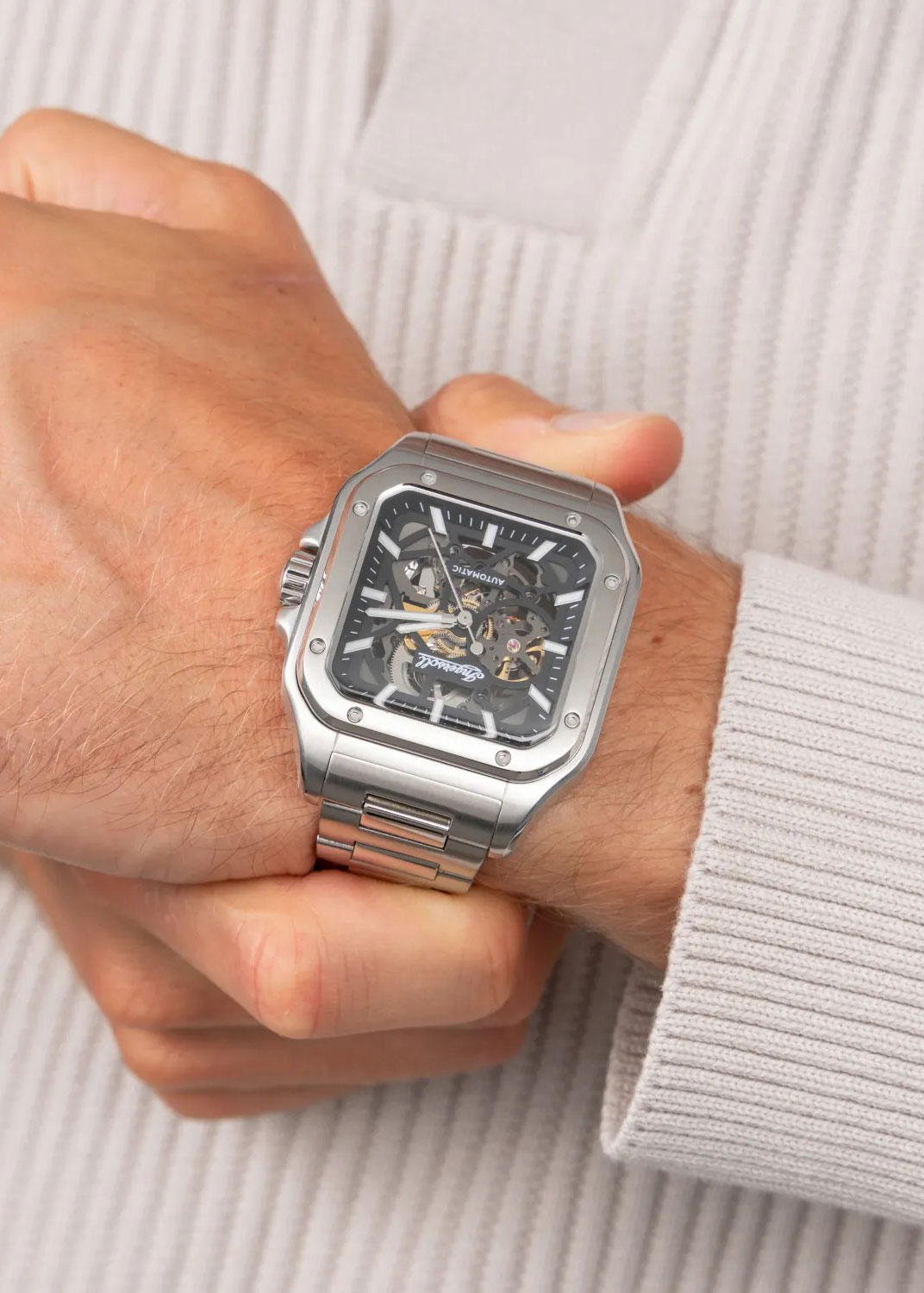 Скелетонизированные часы. В механизме 20 камней. Стальной корпус. Метки в виде штрихов. Рифленая заводная головка с защитой. Задняя крышка крепится на 4 винтах. Стальной браслет с раскладывающейся застежкой.