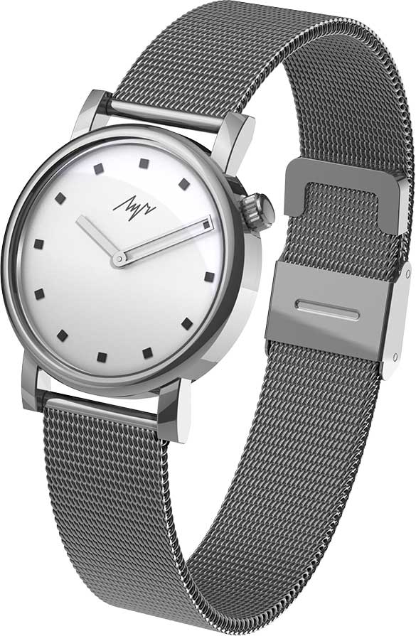 Женские часы. В механизме 15 камней. Запас хода 38 часов. Противоударное устройство оси баланса. Циферблат с метками в виде точек. Заводная головка находится в положении 2 часа. Задняя крышка с прозрачным окошком. Браслет миланского плетения с системой быстрой замены.