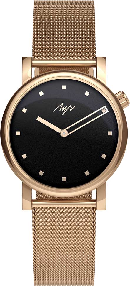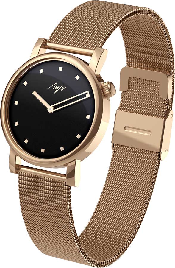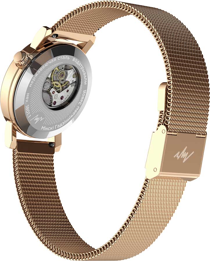 Женские часы. В механизме 15 камней. Запас хода 38 часов. Противоударное устройство оси баланса. Циферблат с метками в виде точек. Заводная головка находится в положении 2 часа. Задняя крышка с прозрачным окошком. Браслет миланского плетения с системой быстрой замены.