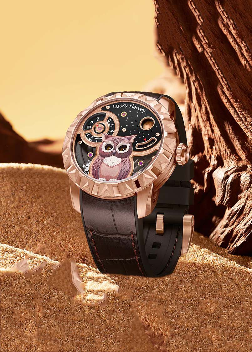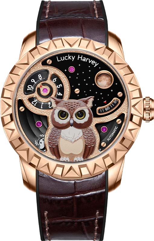 Круглый стальной корпус с текстурным безелем. Технология автоматона оживляет циферблат: сова двигает глазами, мыши появляются и исчезают, а лунное затмение сменяет день ночью. На вращающихся дисках — указатели часов и минут.