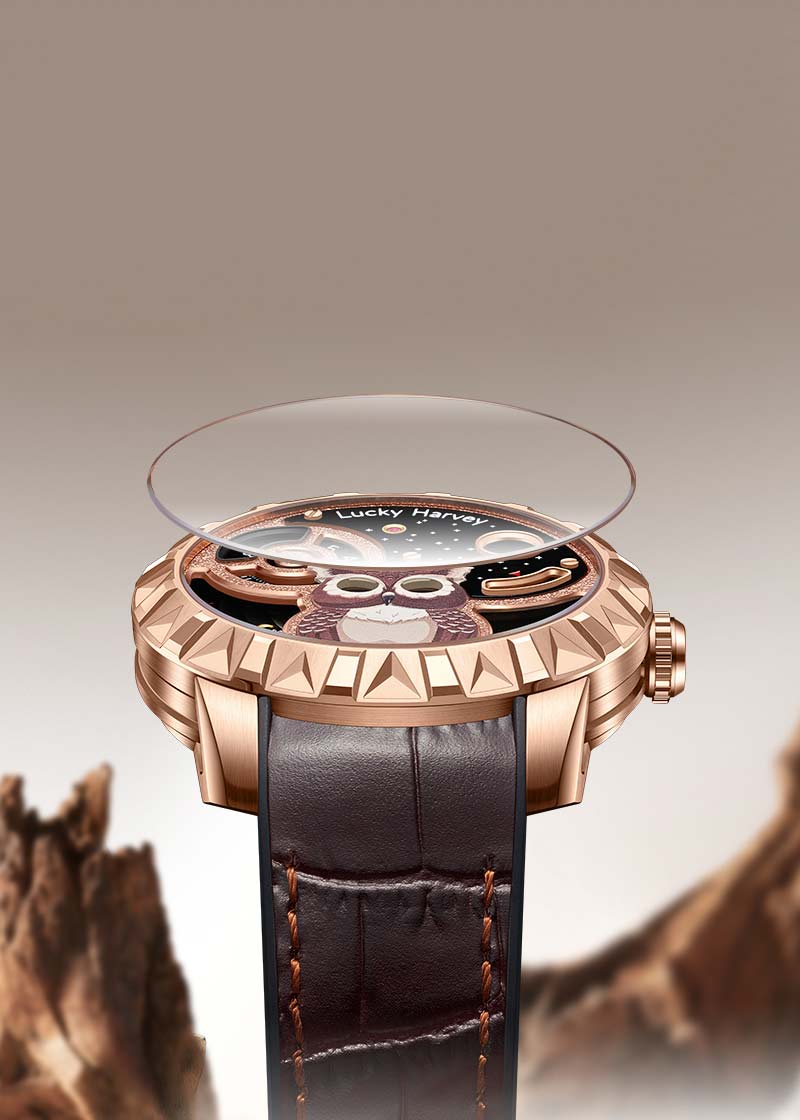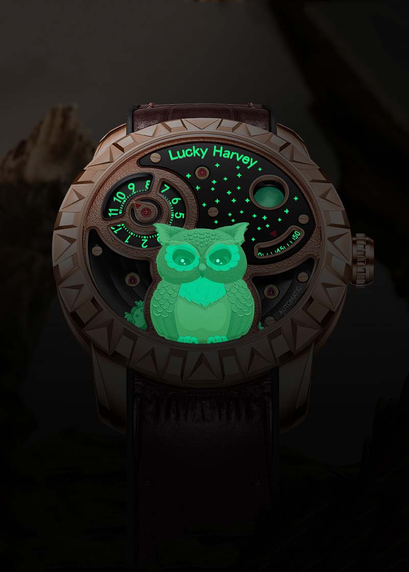 Мужские наручные часы Owl. Часы оснащены высокочастотным механизмом с автоподзаводом LH001 собственной разработки бренда. В механизме 32 камня, частота 28800 полуколебаний в час. Запас хода 40 часов. Ротор выполнен в виде совы.