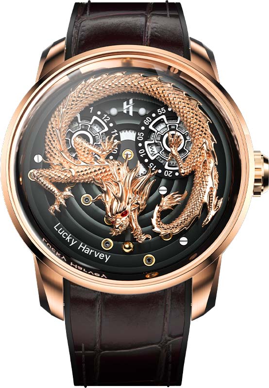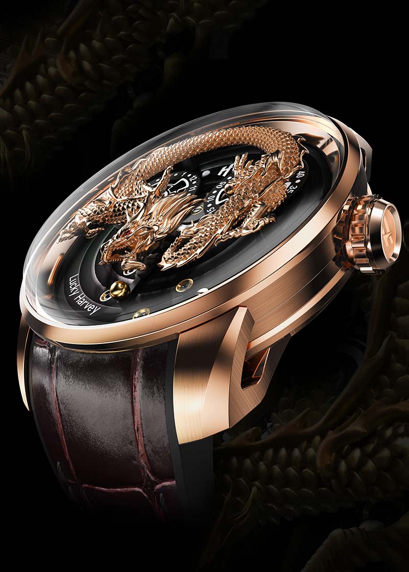 Серия Dragon вдохновлена легендами о драконе, олицетворяющем в Китае высшую власть. Будучи главой четырех духов древности, он также является символом удачи. Циферблат дополнен объемным, детально проработанным китайским драконом, извергающим золотые бусины из золота 999 пробы.