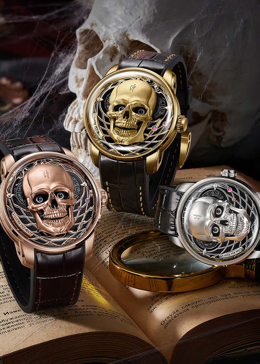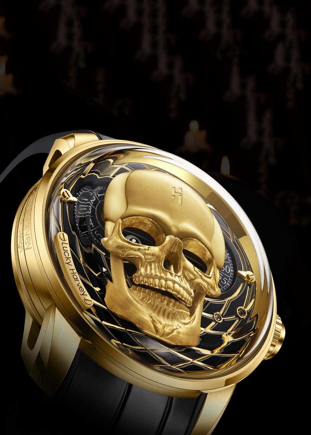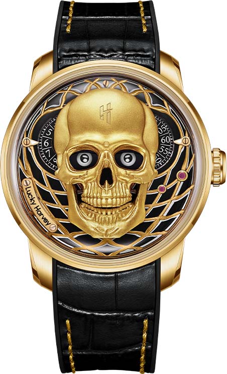 Циферблат дополнен объемным, детально проработанным черепом с пескоструйной обработкой, открывающим глаза и опускающим челюсть. На вращающихся дисках — указатели часов и минут. Метки в виде арабских цифр и отдельные элементы на циферблате с люминесцентным покрытием, которое светится в темноте после непродолжительной зарядки на свету.