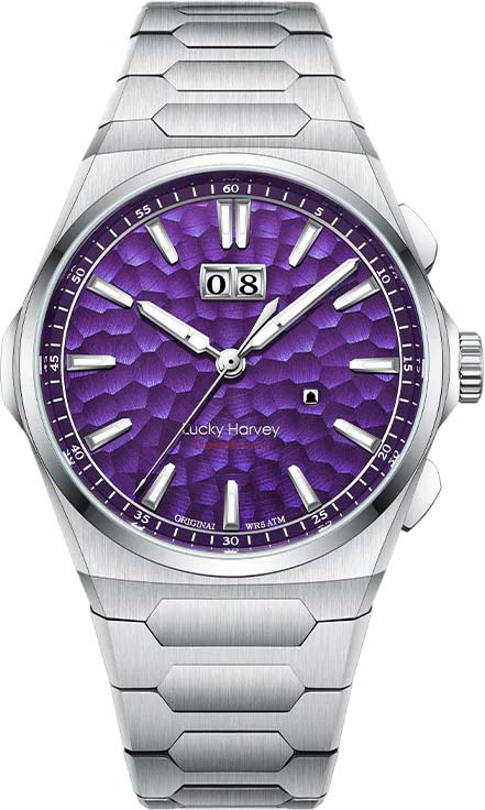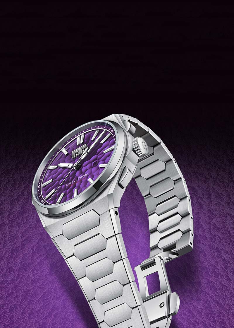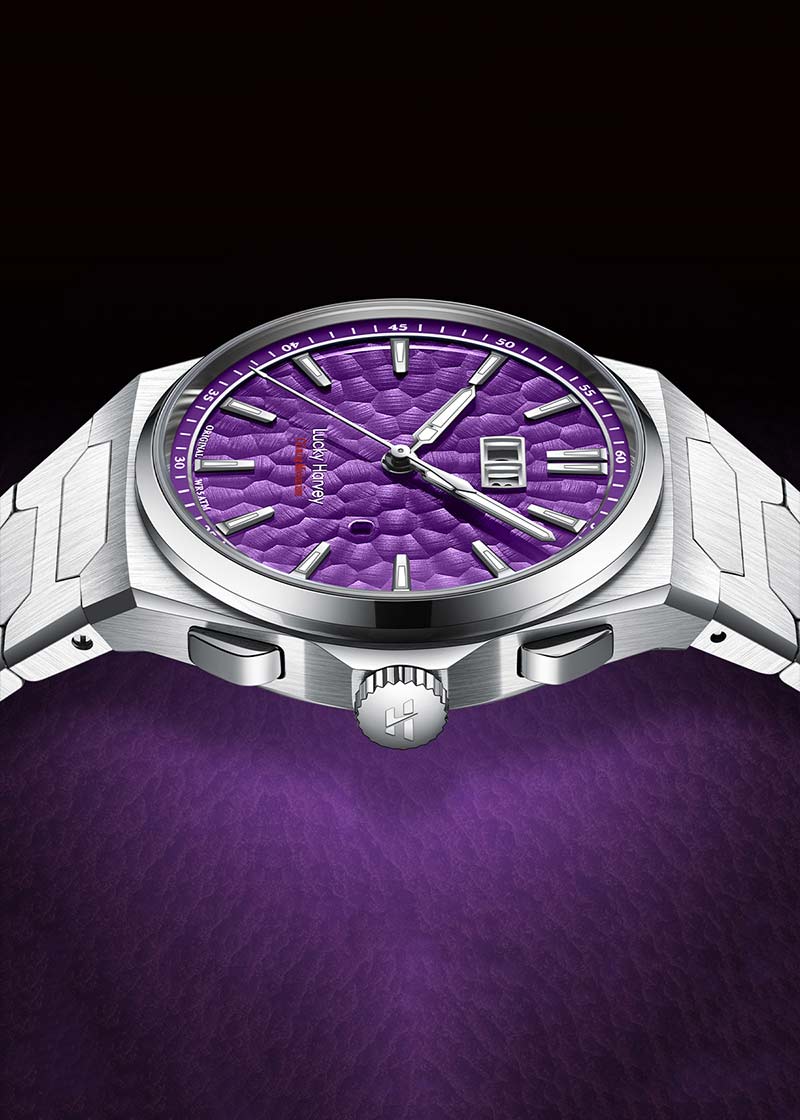 Лимитированная серия — 300 экземпляров. Мужские наручные часы Hammered Texture Sunset Purple. Часы оснащены новым высокочастотным механизмом с автоподзаводом LH003 собственной разработки бренда. Частота 28800 полуколебаний в час. Запас хода 40 часов. Круглый стальной корпус. В час молоточек ударяет по пружине гонга, производя четкий, чистый и мелодичный звон. Звуковую функцию боя можно отключить.