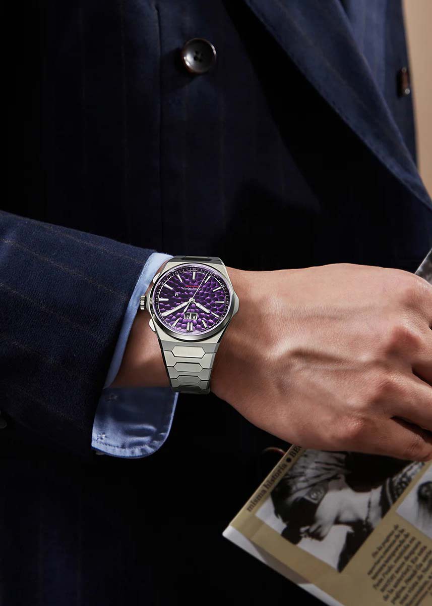 Для создания уникального текстурированного циферблата используют древнюю китайскую технику ручной ковки. Это процесс, при котором на поверхности предмета многократно выбивают узор с помощью молотка и зубила, создавая характерную рельефную текстуру между ударами. Для этого мастерам требуется точный контроль над силой удара, чтобы через эту постоянно меняющуюся тонкую текстуру можно было создать идеальный рисунок.