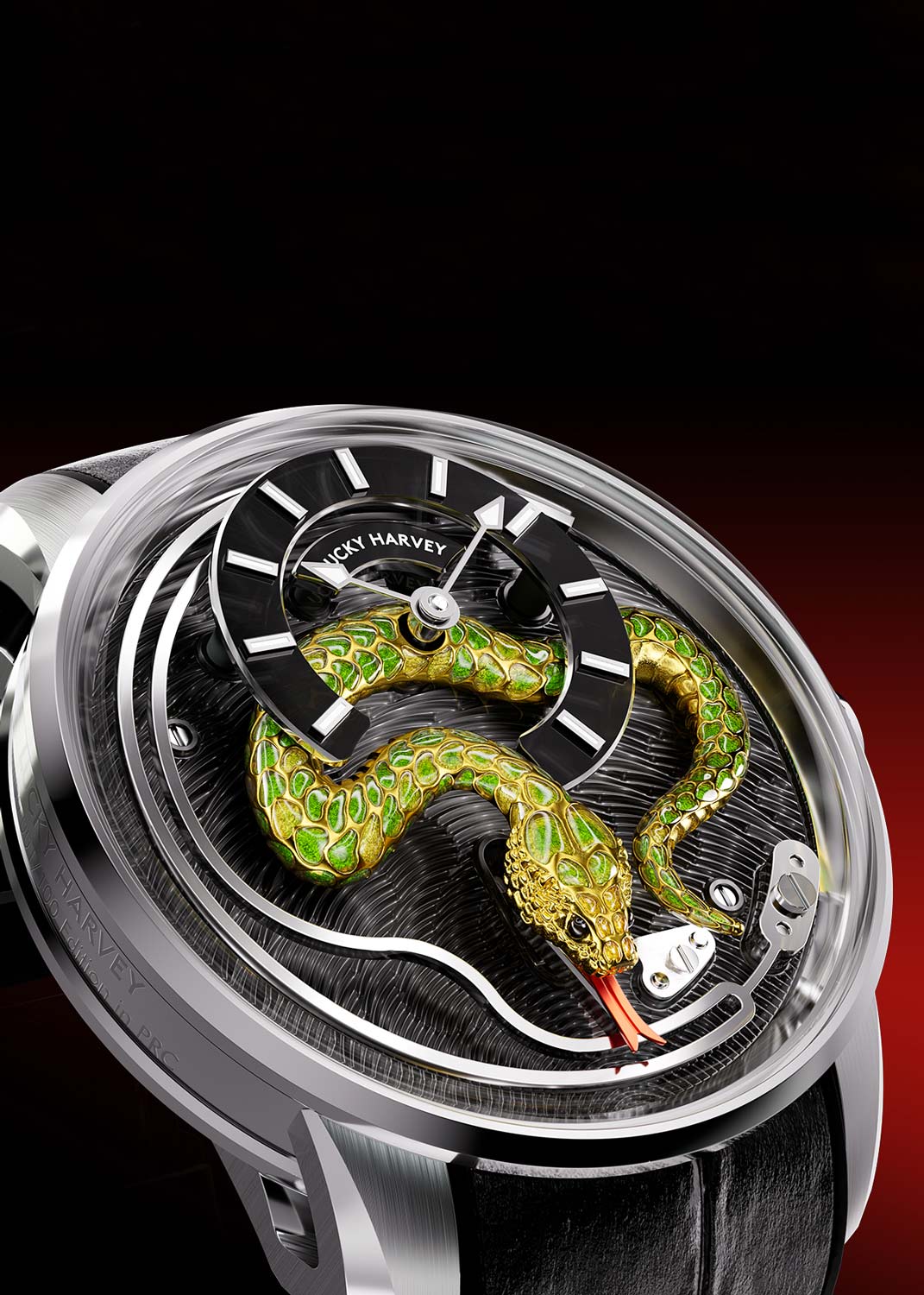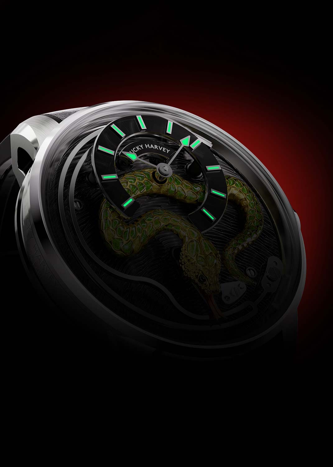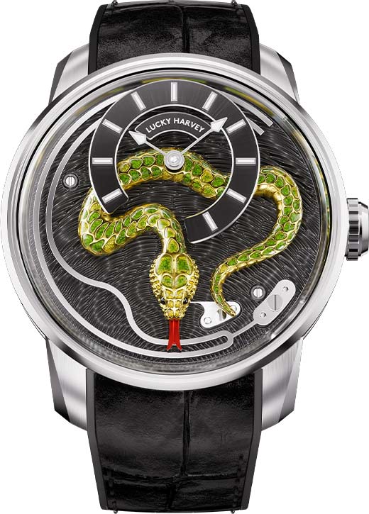 Циферблат дополнен объемной, детально проработанной змеей, высовывающей язык благодаря технологии автоматона. Метки в виде штрихов. Секундная стрелка отсутствует. Стрелки и метки с люминесцентным покрытием, которое светится в темноте после непродолжительной зарядки на свету.