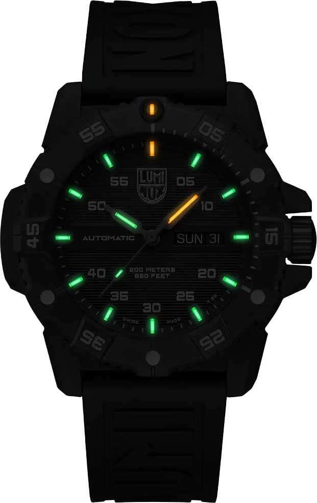 Сверхлегкие и надежные эксклюзивные часы от Luminox покорят вас своим швейцарским качеством и практичным дизайном, став прекрасным ориентиром вашего времени в самых экстремальных условиях. Master Carbon SEAL Automatic 3860 Series. Мужские часы. В механизме 24 камня. Корпус выполнен из усиленного карбона CARBONOX™. Циферблат с метками в виде штрихов защищен прочным сапфировым стеклом. Специальная технология LLT позволяет определять время в условиях полной темноты и будет исправно вам служить на протяжении 25 лет. Окошки даты и дня недели находятся в положении 3 часа. Безель со светящейся меткой на 12 часов вращается в одном направлении. Завинчивающаяся заводная головка с защитой. Завинчивающаяся прозрачная задняя крышка выполнена из стали 316L. Удобный ремешок с раскладывающейся застежкой. Застежка с системой блокировки. Система быстрой замены ремешка.