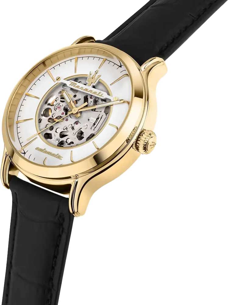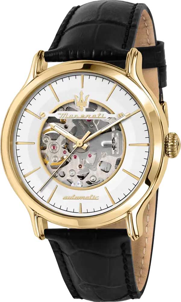 Скелетонизированные часы. В механизме 24 камня, частота 28800 полуколебаний в час. Запас хода 41 час. Возможность ручного завода. Циферблат с метками в виде штрихов украшен фирменным логотипом «Maserati». Завинчивающаяся заводная головка. Завинчивающаяся прозрачная задняя крышка. Ремешок с классической застежкой.