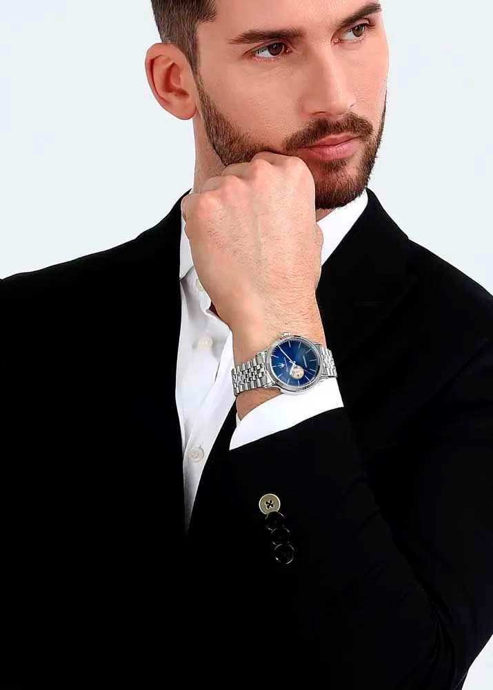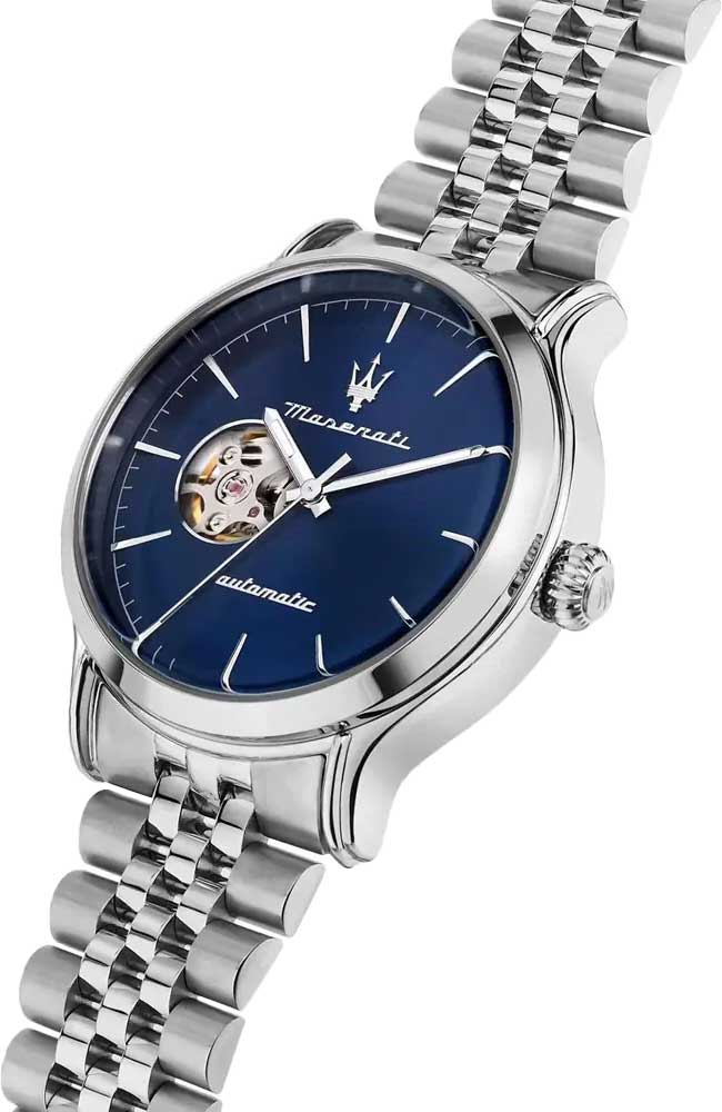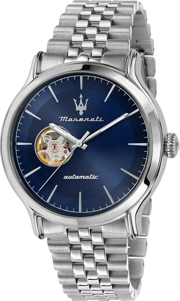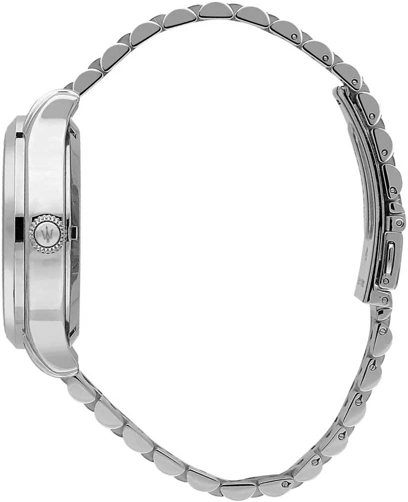 Мужские часы. В механизме 24 камня, частота 28800 полуколебаний в час. Запас хода 41 час. Возможность ручного завода. Циферблат выполнен по технологии Sunray (солнечные лучи) и украшен фирменным логотипом «Maserati». Метки в виде штрихов. Завинчивающаяся заводная головка. Завинчивающаяся прозрачная задняя крышка. Браслет с раскладывающейся застежкой.