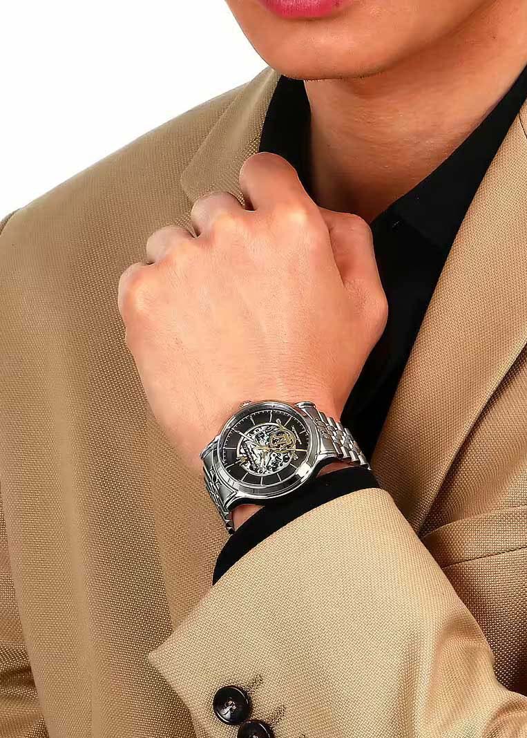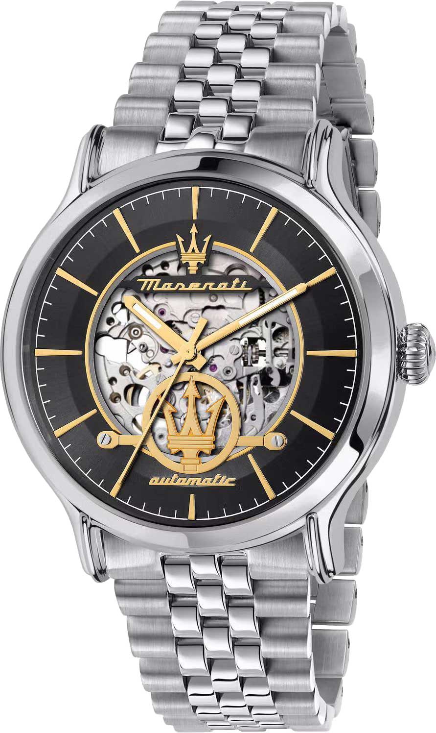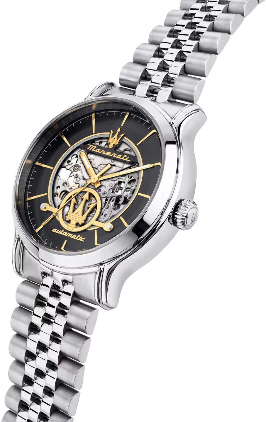 Скелетонизированные часы. В механизме 21 камень, частота 21600 полуколебаний в час. Запас хода до 42 часов. Возможность ручного завода. Функция stop-second. Циферблат с метками в виде штрихов украшен фирменным логотипом «Maserati». Завинчивающаяся заводная головка. Завинчивающаяся прозрачная задняя крышка. Браслет с раскладывающейся застежкой.