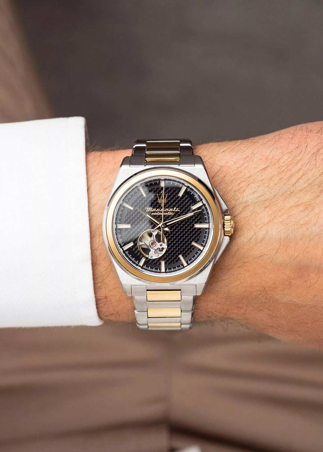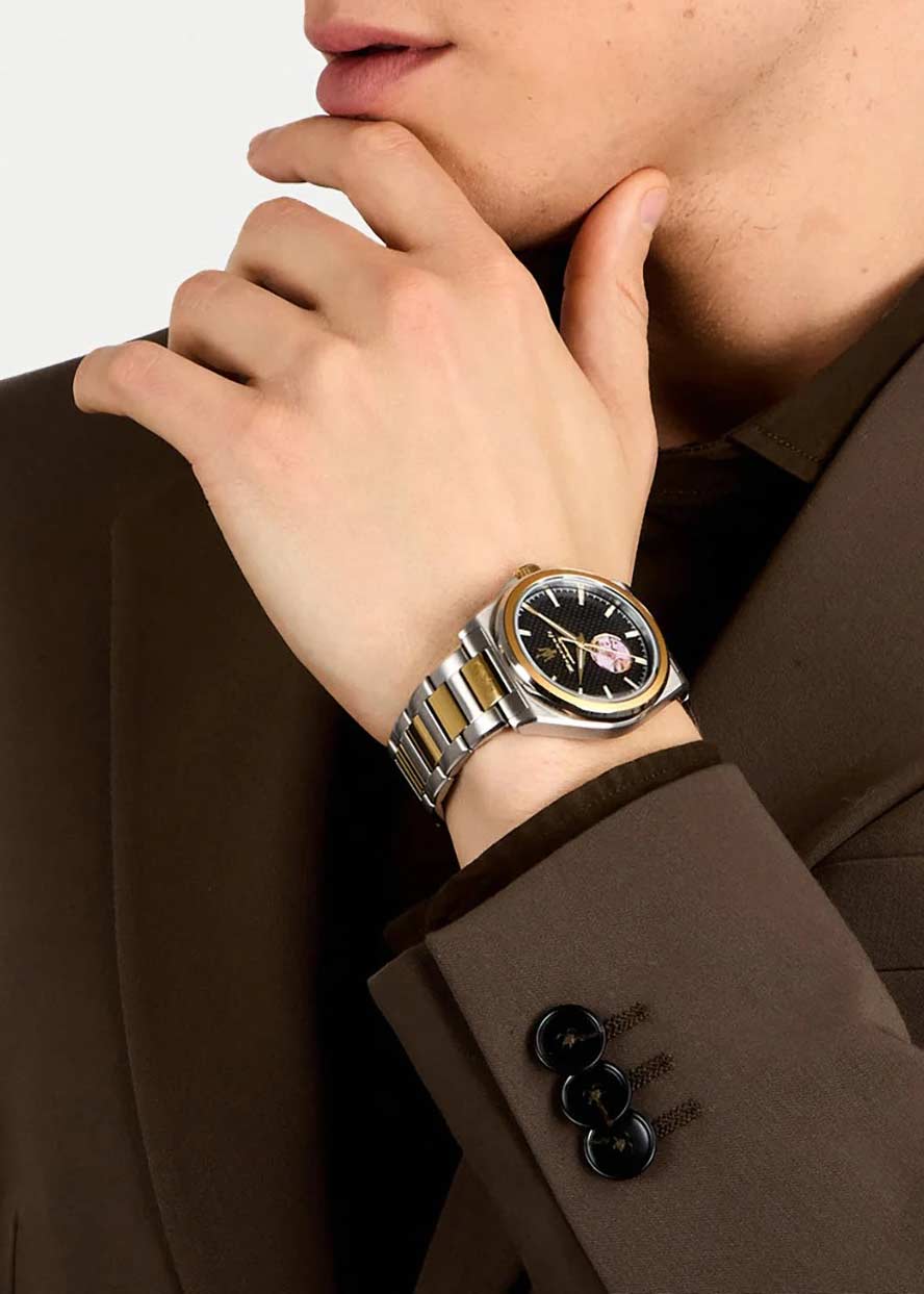 Мужские наручные часы. В механизме 21 камень. Круглый стальной корпус. Карбоновый циферблат с метками в виде штрихов украшен фирменным логотипом ''Maserati''. Сквозь прозрачное окошко на циферблате можно наблюдать за работой механизма часов.