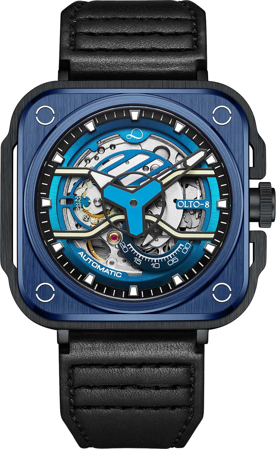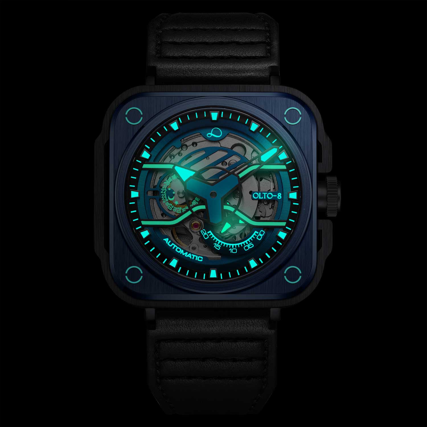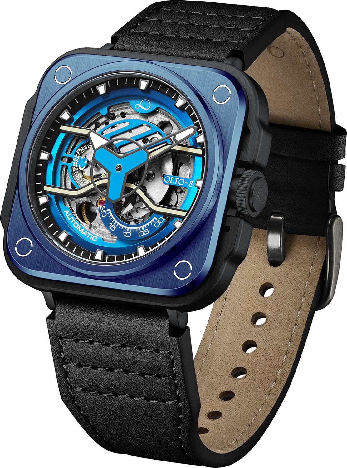 покрытием Super Luminova, которое светится в темноте после непродолжительной зарядки на свету. Заводная головка с защитой. Задняя крышка крепится на 4-х винтах и имеет прозрачное окошко, через которое можно наблюдать работу механизма часов. Ремешок с классической застежкой и системой быстрой замены.