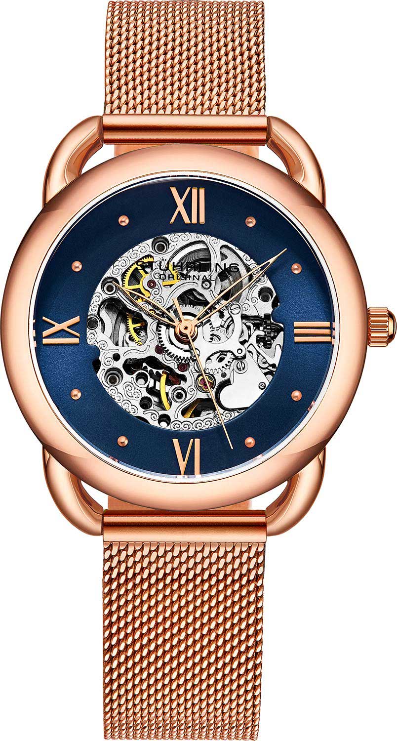 Legacy. Скелетонизированные часы. Циферблат выполнен по технологии Sunray (солнечные лучи). Накладные метки в виде точек и римских цифр. Завинчивающаяся задняя крышка со стеклом. Рифленая заводная головка. Браслет миланского плетения.