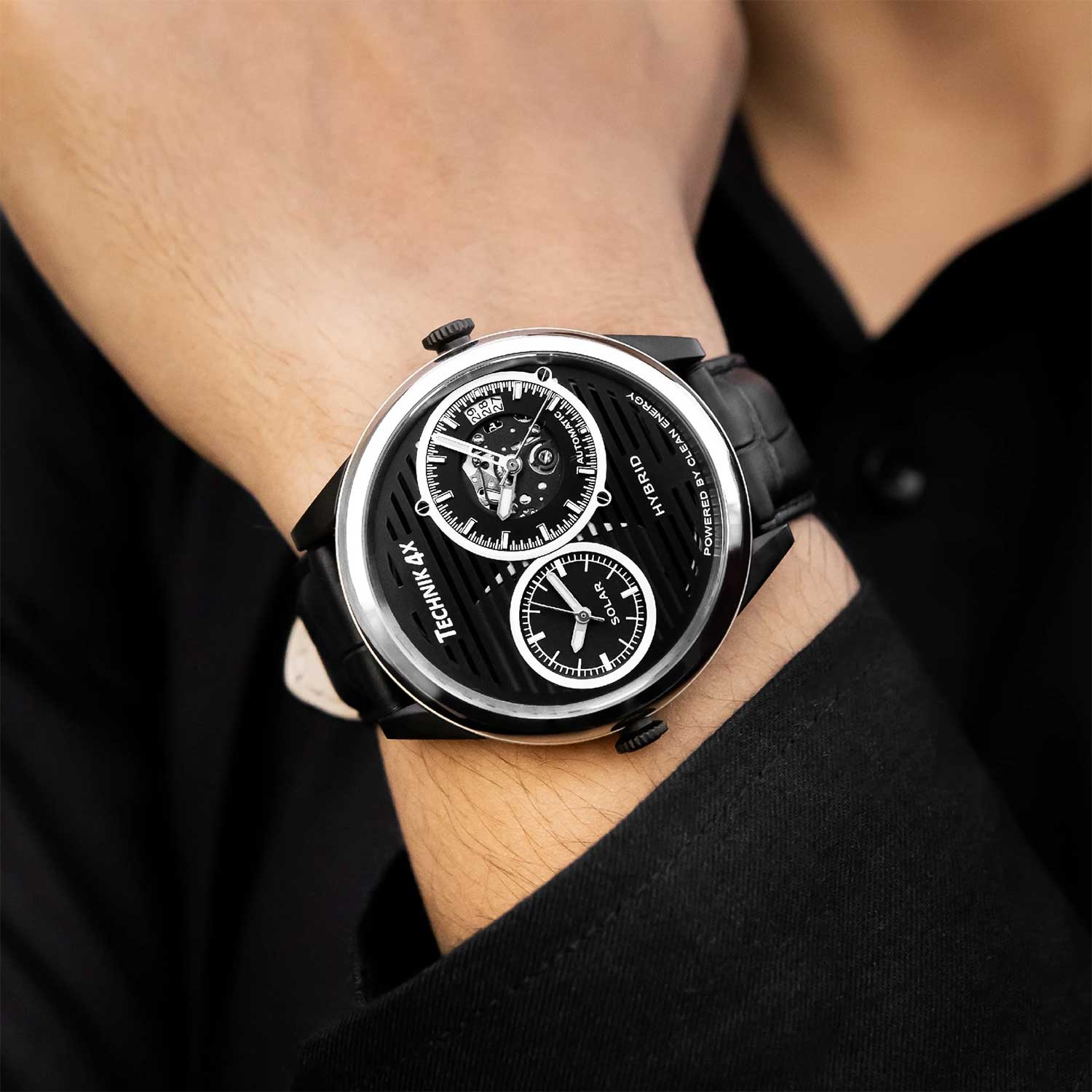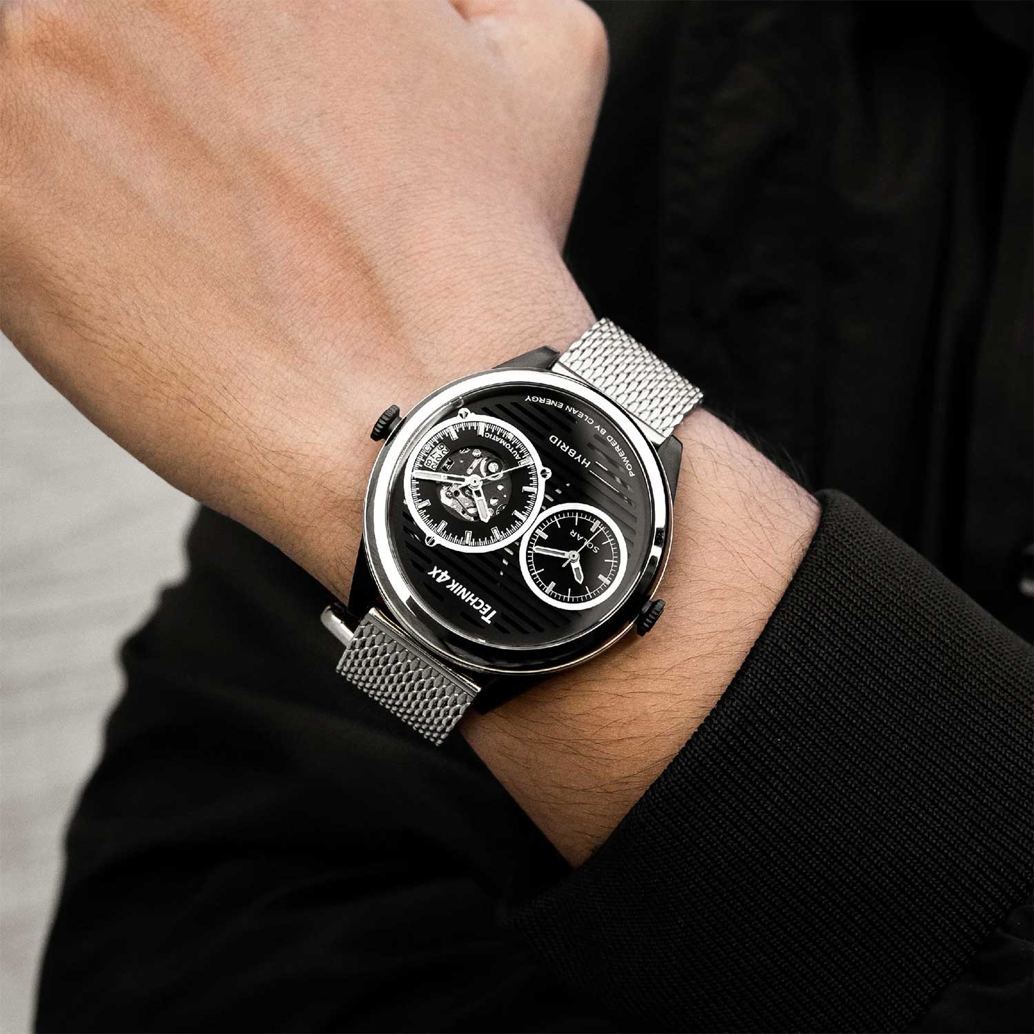 Современный дизайн придется по душе любому мужчине, который ценит надежность, практичность и комфорт. Скелетонизированные часы, изготовленные из переработанных материалов. Два японских механизма находятся на стальном держателе, который покрыт родиевым покрытием и украшен узором ''женевские волны''. Второй часовой пояс. В механическом механизме 21 камень, частота 21600 полуколебаний в час. Запас хода 40 часов. Кварцевый механизм питается от солнечной энергии. Время работы аккумулятора без подзарядки приблизительно 6 месяцев. Метки в виде штрихов. 10-ти слойное антибликовое покрытие стекла позволит четко видеть циферблат даже в самый яркий день. Прозрачная задняя крышка с сапфировым стеклом крепится на 4-х винтах. Браслет миланского плетения с раскладывающейся застежкой и системой быстрой замены. В комплекте сменный кожаный ремешок.