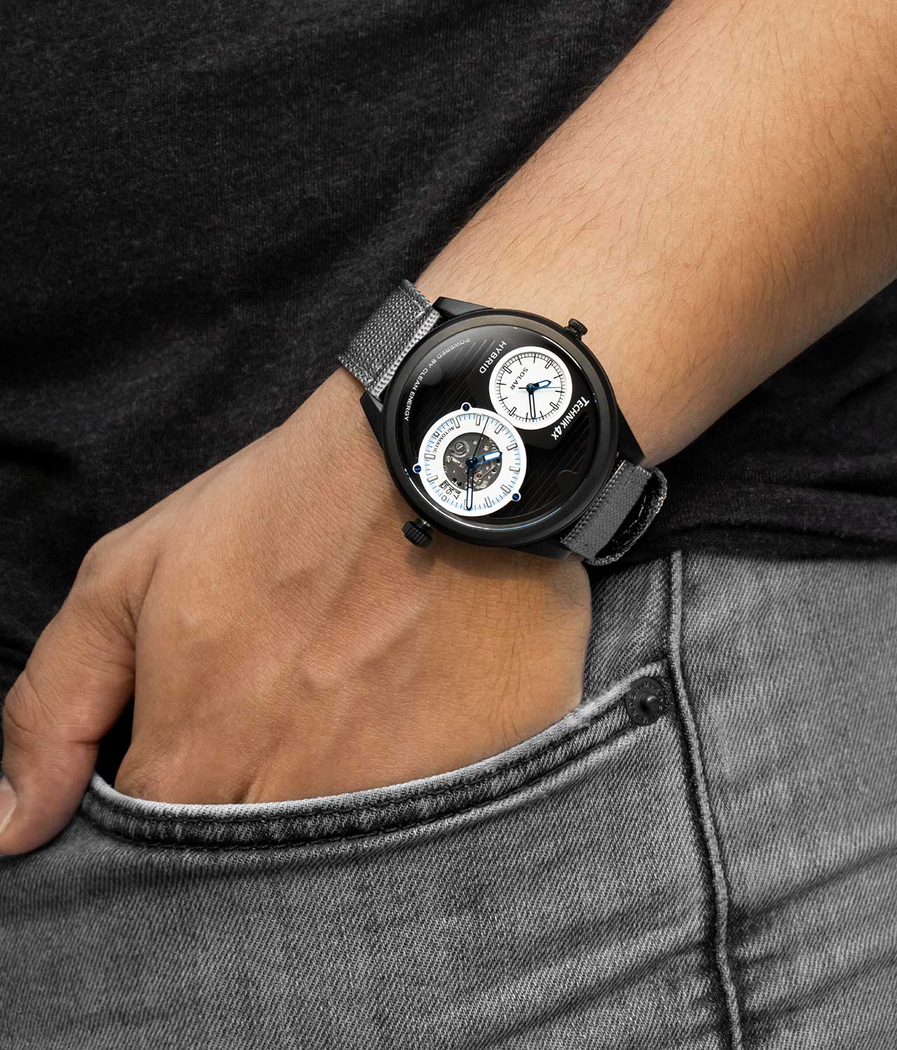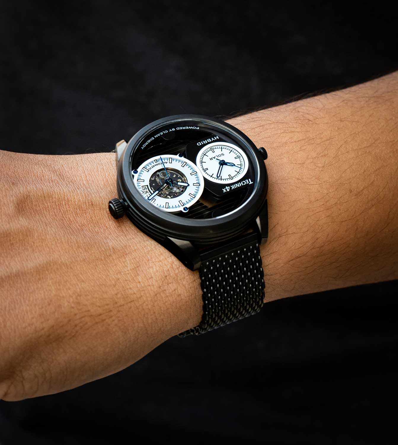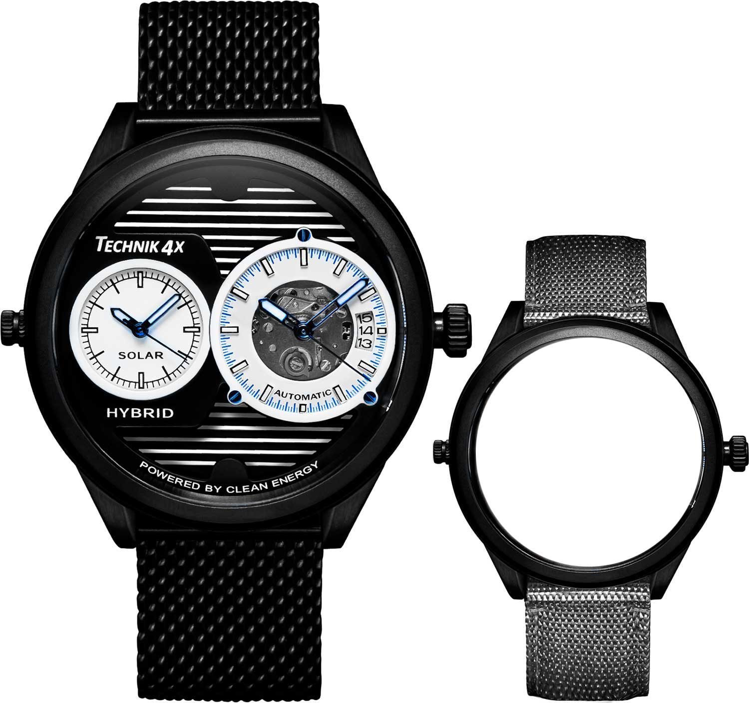 Два часовых пояса делают из этого аксессуара идеального компаньона в любом путешествии. Скелетонизированные часы Skeletor Pro, изготовленные из переработанных материалов. Два японских механизма находятся на стальном держателе, который покрыт родиевым покрытием и украшен узором ''женевские волны''. Второй часовой пояс. В механическом механизме 21 камень, частота 21600 полуколебаний в час. Запас хода 40 часов. Кварцевый механизм питается от солнечной энергии. Время работы аккумулятора без подзарядки приблизительно 6 месяцев. Метки в виде штрихов. 10-ти слойное антибликовое покрытие стекла позволит четко видеть циферблат даже в самый яркий день. Прозрачная задняя крышка с сапфировым стеклом украшена полосами и крепится на 4-х винтах. Браслет миланского плетения с раскладывающейся застежкой и системой быстрой замены. В комплекте сменный нейлоновый ремешок.