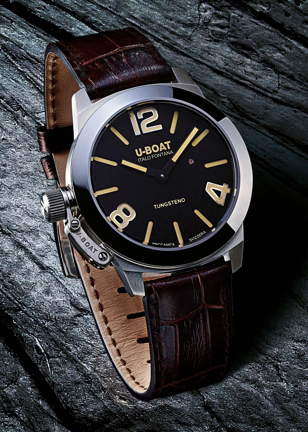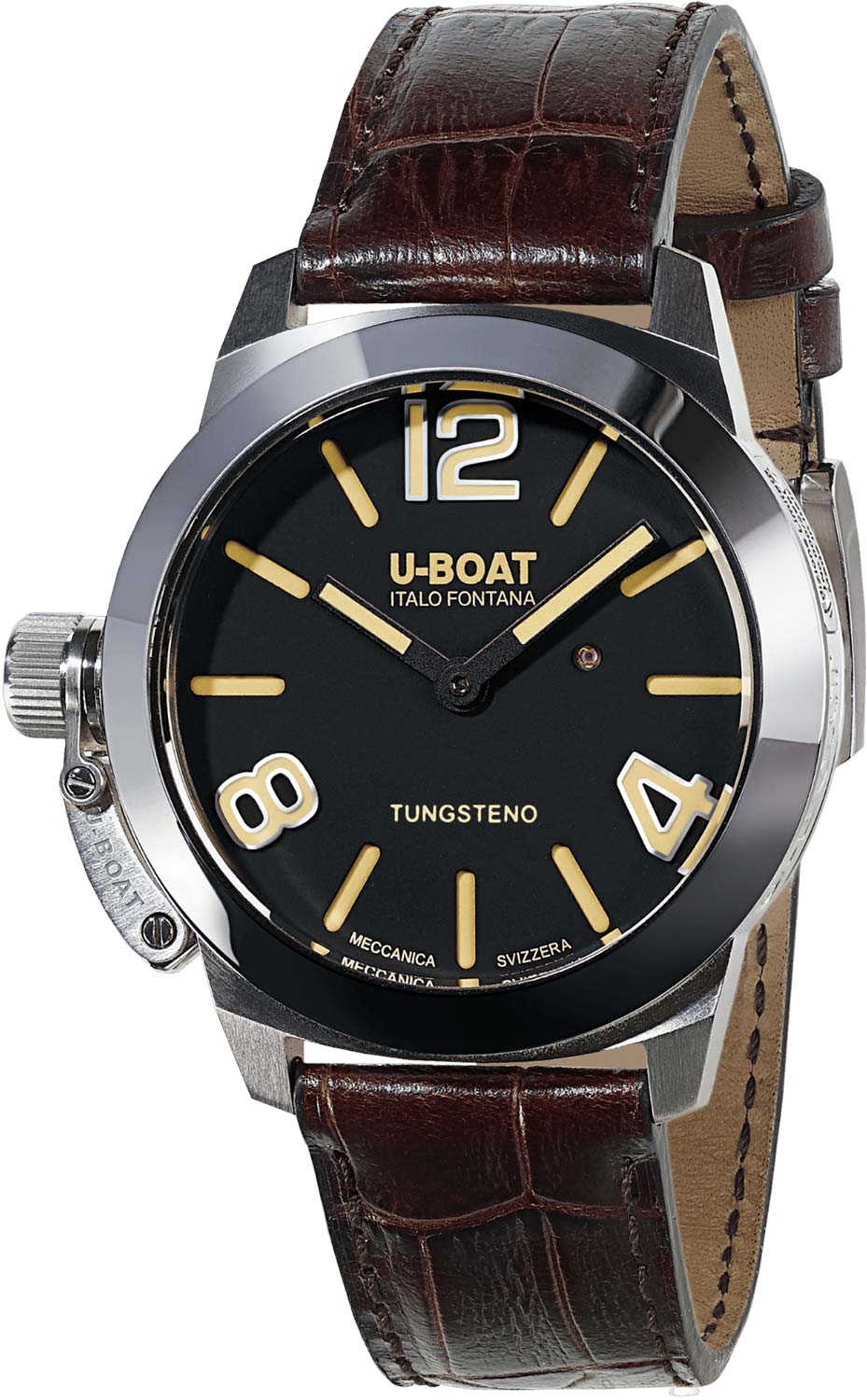 Classico. Мужские наручные часы. Круглый стальной корпус. В механизме 17 камней, частота 21600 полуколебаний в час. Запас хода 42 часа. Полированный вольфрамовый безель. Циферблат с метками в виде штрихов и арабских цифр 4, 8 и 12. Стрелки и метки с люминесцентным покрытием SuperLuminova, которое светится в темноте после непродолжительной зарядки на свету.