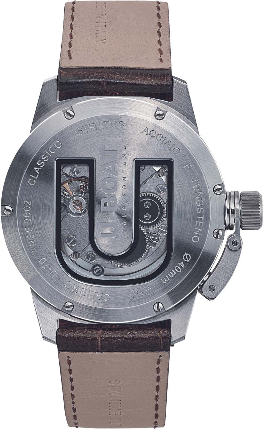 Рифленая заводная головка расположена слева, что обеспечивает комфортное ношение на правой руке. Вырез на задней крышке с сапфировым стеклом в форме английской буквы U, через который виден механизм. Задняя крышка крепится на 7 винтах. Кожаный ремешок из кожи аллигатора оснащен классической застежкой.