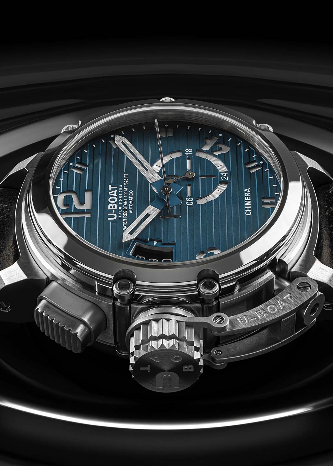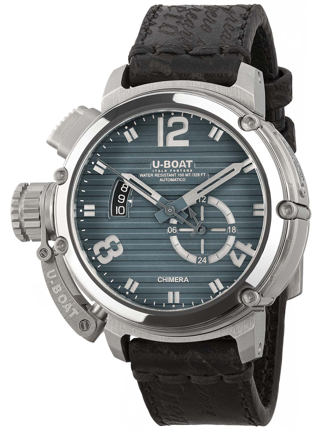 Chimera. Мужские наручные часы. Лимитированная серия — 300 экземпляров. Порядковый номер указан на плашке, на корпусе. Круглый стальной корпус. В механизме 25 камней, частота 28800 полуколебаний в час. Запас хода 38 часов. Циферблат с метками в виде штрихов и арабских цифр 4, 8 и 12. Окошко даты находится на отметке 9 часов. 12-ти и 24-х часовой формат времени вынесен на отдельный циферблат.